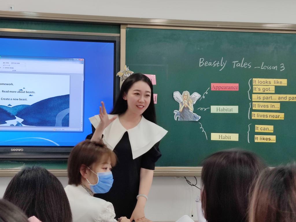 我校六年级英语老师陈莎选取剑桥六年级教材第一单元的文段阅读,展示了一节示范课。教材文本以Beastly Tales为主题,描述了六种西方文化中的神兽。陈莎老师利用任务型阅读与读写结合实践,引导学生运用文段中的功能句,模仿段落结构进行口语表达和仿写。同时在读前、读中和读后环节分别设计了学习理解、应用实践和迁移创新类活动,通过不同层次的活动重点培养学生的阅读能力和语言表达能力。