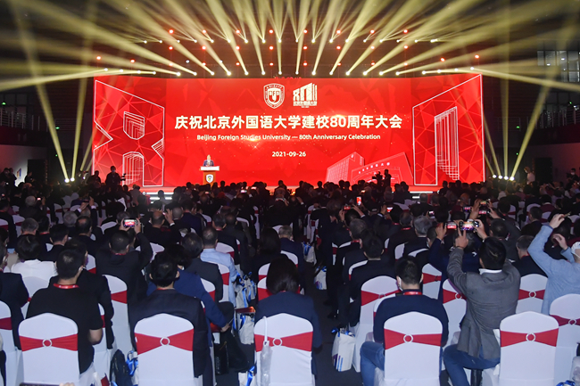 上午9时30分,庆祝北京外国语大学建校80周年大会在体育馆隆重举行。全体师生员工、海内外校友和关心北外发展的各界人士相聚线上线下,共襄盛举,见证北外荣光。