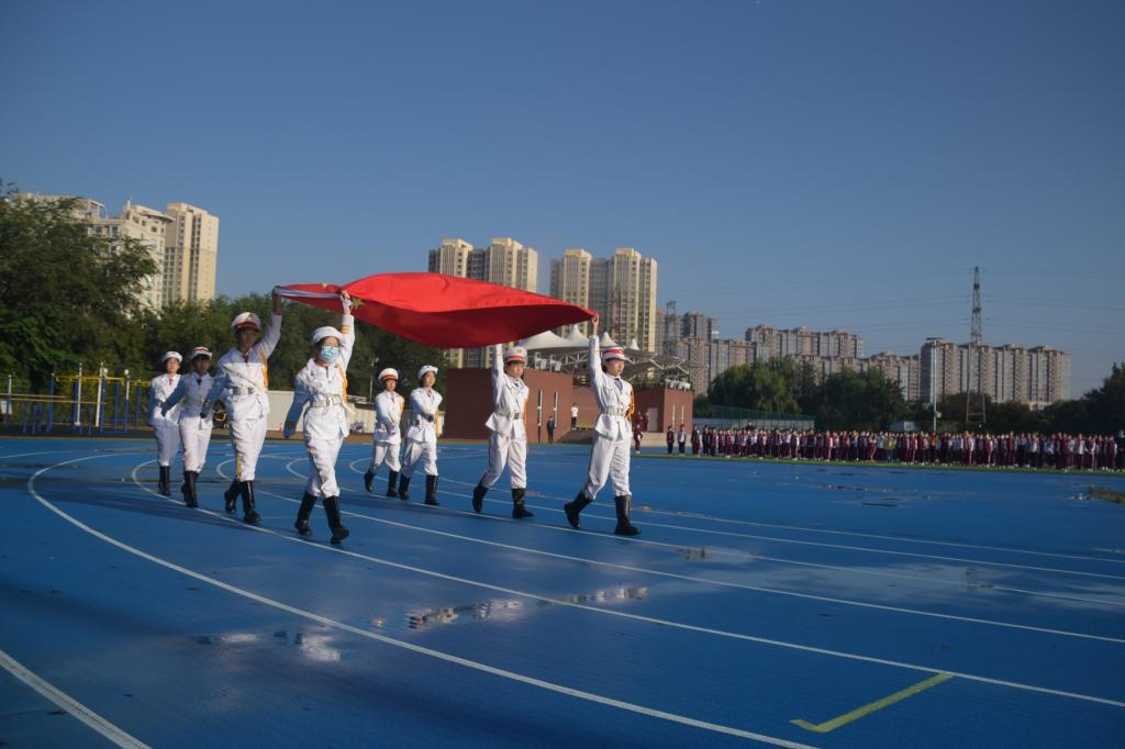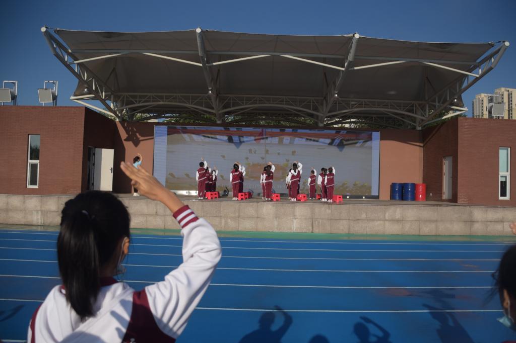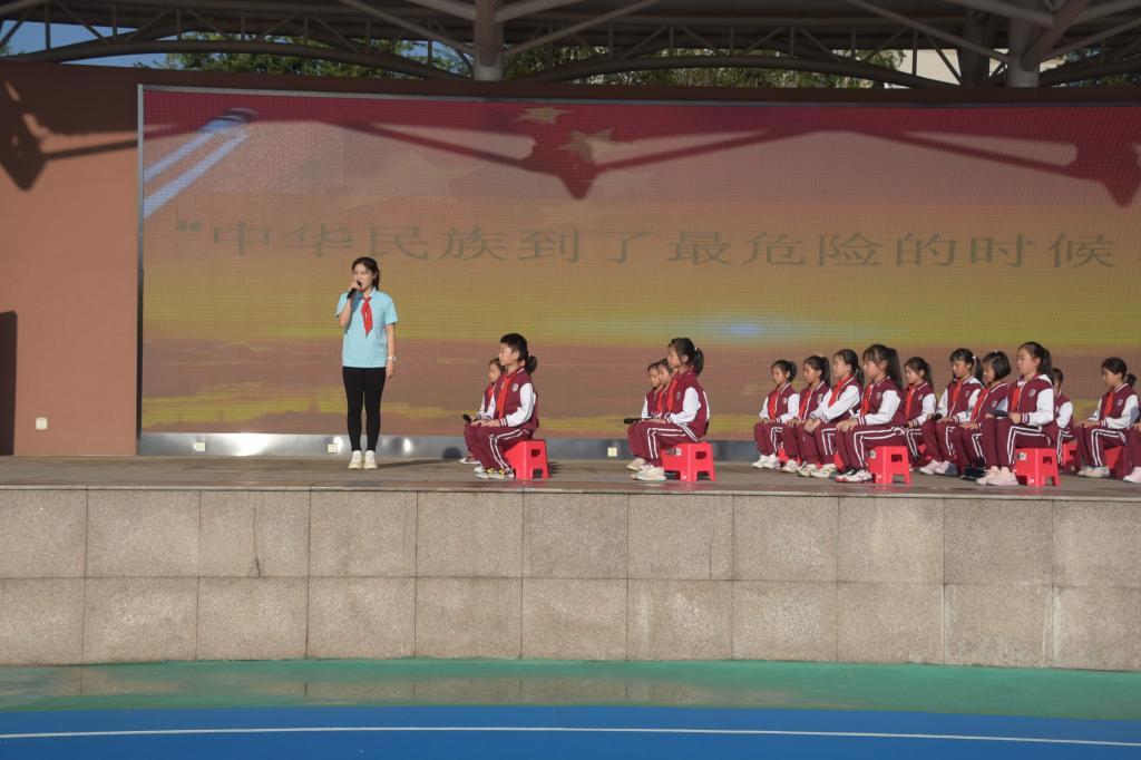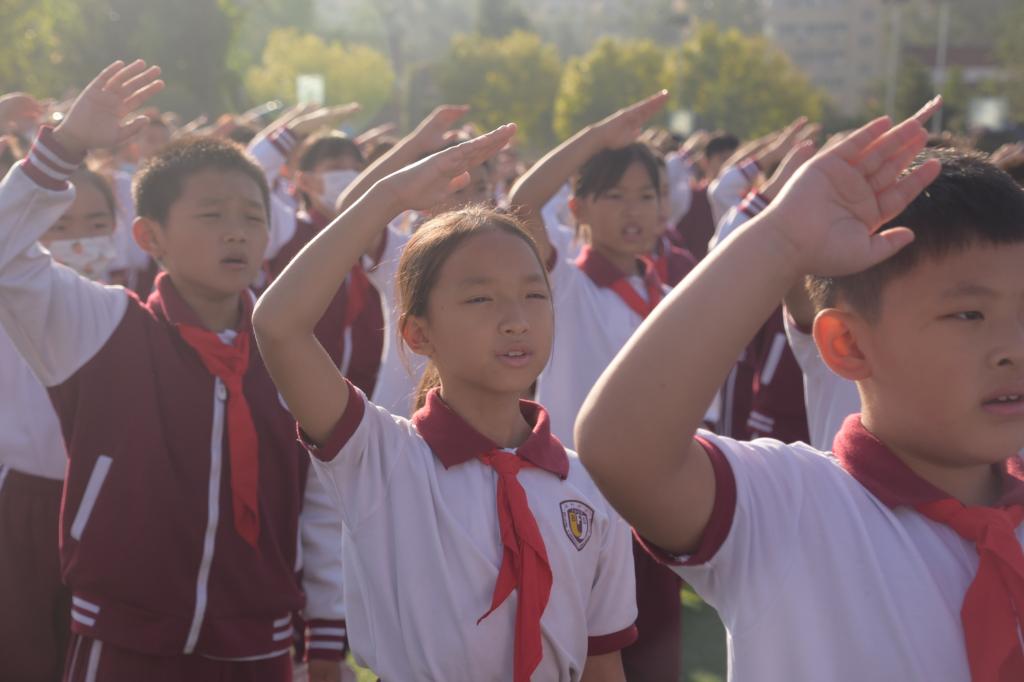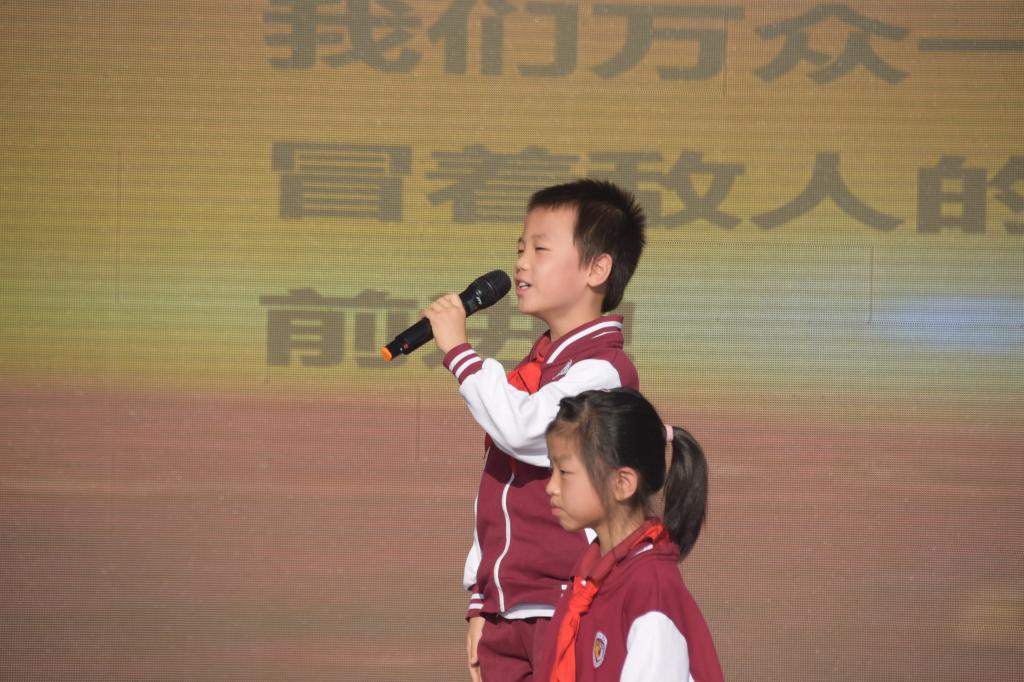 为迎接即将到来的国庆节,引导教育学生了解国歌背后的故事,厚植学生爱国情怀,弘扬爱国主义精神,规范学生演唱国歌的精神面貌。9月27日上午,我校小学举行主题为“奋进的号角 吹响中国最强音”第5周升旗仪式。学校领导、行政人员及小学全体师生参加,仪式由六(3)班候芸熙、六(8)付思铖用双语进行主持。