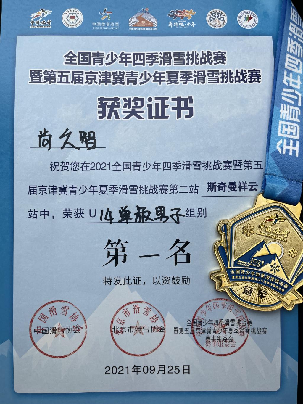 2021年9月25日,全国青少年四季滑雪挑战赛暨第五届京津冀青少年夏季滑雪挑战赛在北京成功举办。我校初一(5)班尚久智同学,在本届比赛第二站(北京顺义区)中以全场单板最高分荣获U14单板男子组第一名。