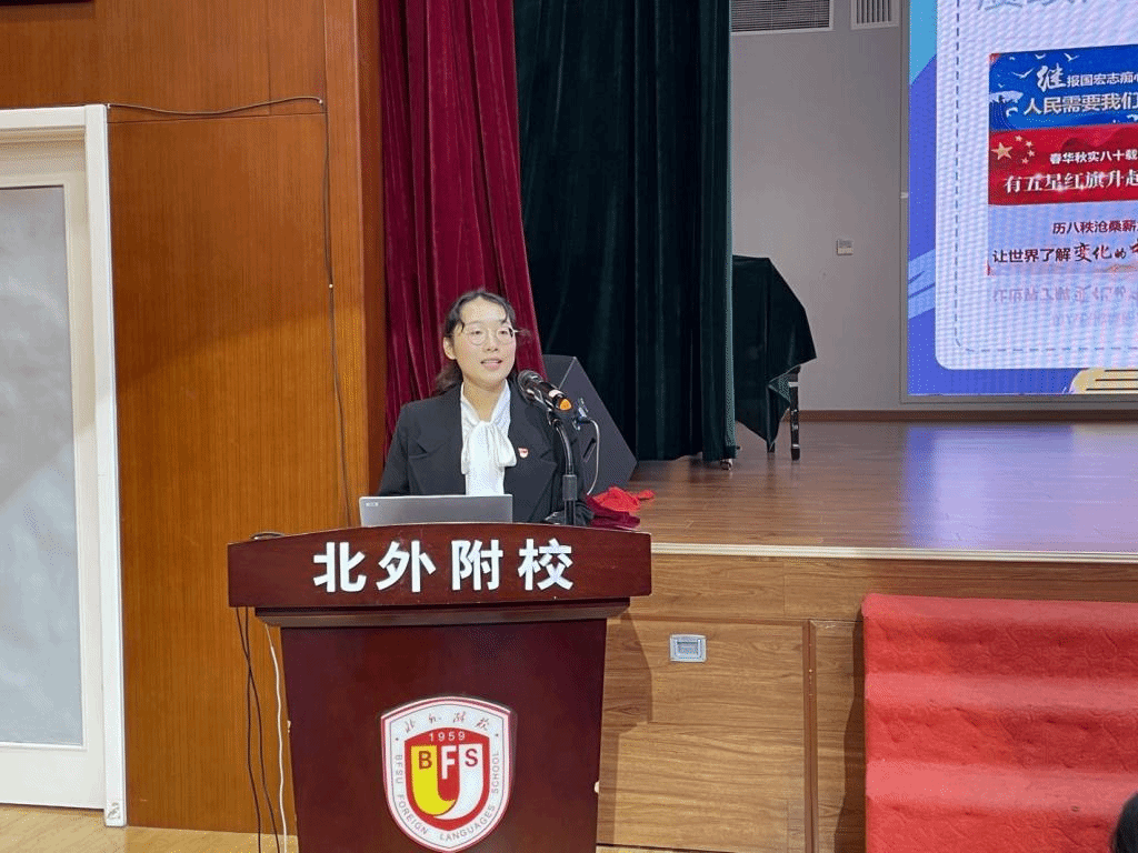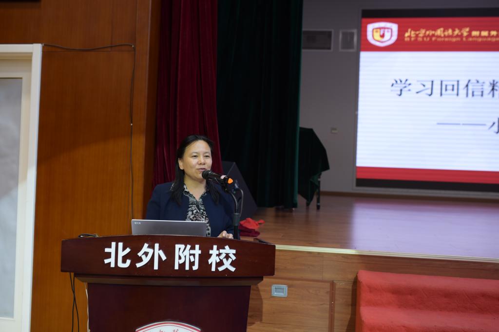 李萍老师以“学习回信精神,践行初心使命”为主题,阐述了如何做有责任担当的人民教师,以及如何结合学科教学讲好中国故事。辛勤耕耘数十载,矢志为党和国家培养外语人才的北外老教授们用实际行动书写了人民教师的责任担当,老师们在老教授身上懂得了辛勤耕耘是责任担当、兢兢业业是责任担当、坚持不懈是责任担当、目标明确是责任担当、时刻心系国家,心系教育,矢志为党为国家培养人才是责任担当。作为音乐教师,在平时的课堂教学中李老师积极学习奥尔夫教学法、柯达伊教学法、达尔克罗兹体态律动等优秀教育理念及教学法,大胆创新地将这些方法运用到课堂教学中去,让学生爱上音乐课堂,为了让学生在比赛中取得佳绩,她和社团中其他老师一起利用课余和周末时间,争分夺秒排练,指导学生在海淀区学生艺术节合唱展演中获得金奖。李老师还将中国传统文化故事搬上舞台,引导学生学习不同语种的歌曲,用外语戏剧传递中国文化,讲述中国故事,在学科教学活动中积极培养有家国情怀,有全球视野,有专业本领的附校学习。