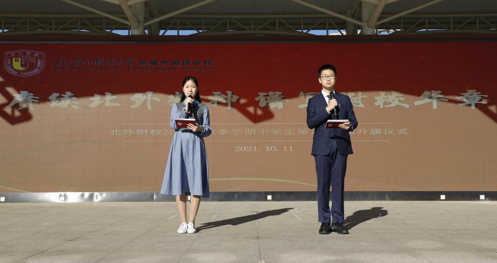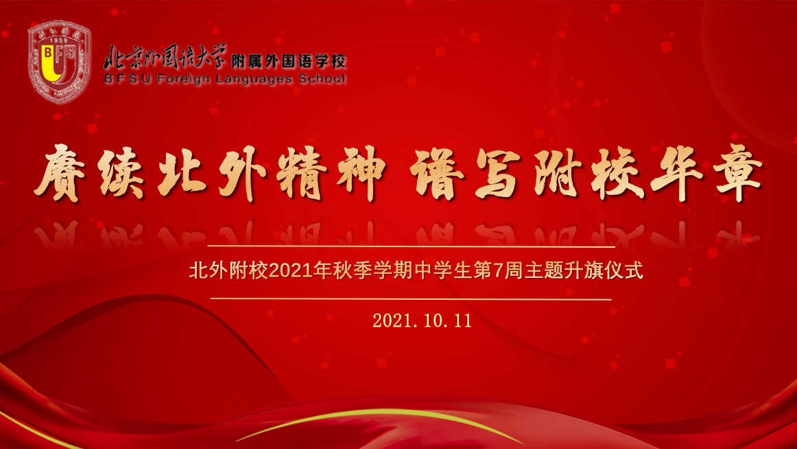 六十二载风雨沧桑,弘歌不辍;几代人躬耕树蕙,铸就辉煌。2021年10月11日我校在操场举行以“赓续北外精神 谱写附校华章”为主题的升旗仪式。负责本次升旗仪式的班级是高二(3)班。主持人是王鸣宇、穆高乐。升旗手是贾梓杰。