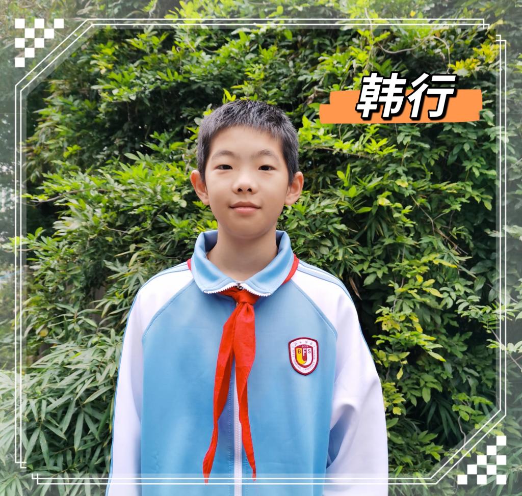 韩行同学在七(1)中队中担任中队长,他对待工作尽职尽责,对待同学真诚友好,是老师的得力助手。他学习成绩优秀,在学习上严格要求自己,不断进取。2021年获得“北京市三好学生”,2020年获得“希望数学2020国际精英挑战赛”个人优胜奖,2021年获得“数学花园探秘”三等奖等。他爱好广泛,学校的各种活动总能见到他的身影,比如机器人小组,合唱团,学校图书馆志愿者管理员等,并多次参加北京青少年机器人竞赛,屡获佳绩。