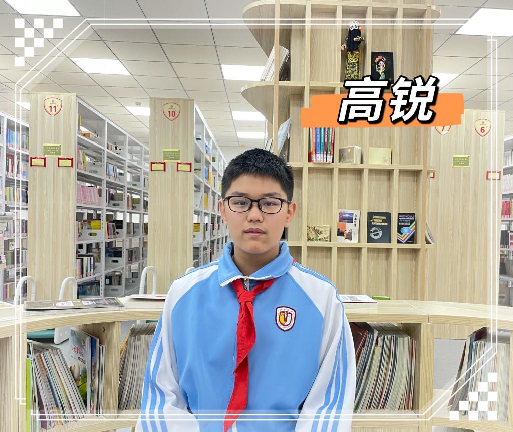 高锐同学在七(4)中队中担任中队长,他团结同学,尊敬师长,孝敬父母,受到老师、同学们的好评。2019年获得“北京市优秀红十字青少年会员”、“北京市建言献策活动”一等奖、“海淀区三好学生”称号等。作为学校红十字会志愿服务队员,他组织开展了多次“青春善言行”实践活动。2020年新冠肺炎疫情期间,录制了《共同抗疫》节目,在学校心灵电台播放。同时,他积极参加校外志愿服务,是故宫的志愿讲解员,他希望用实际行动为传播中国文化贡献自己的力量。