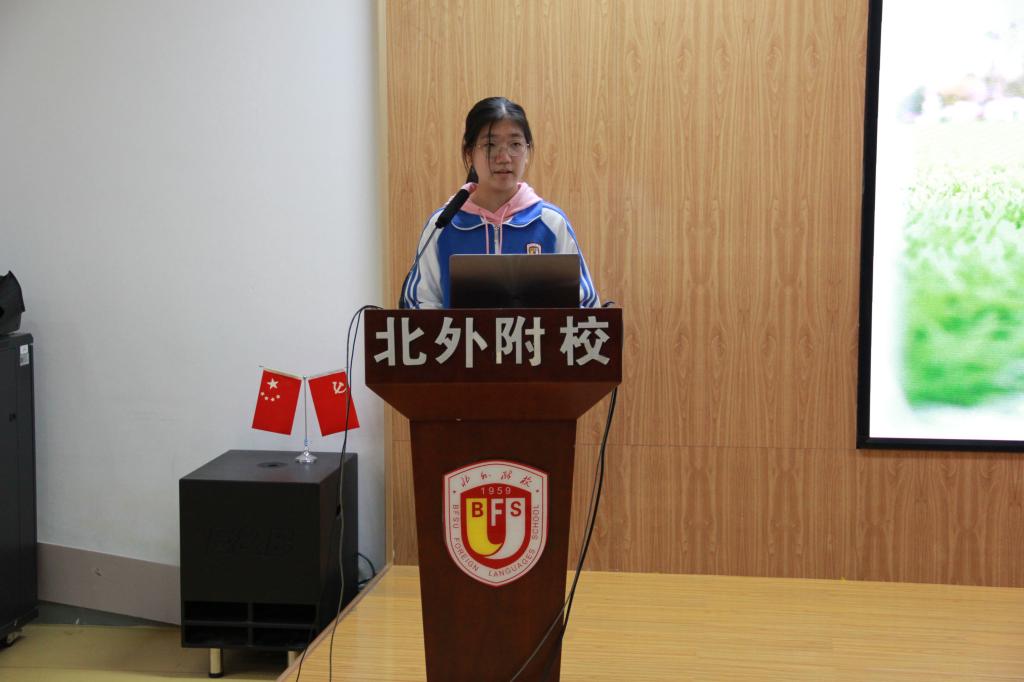 高一(4)班李佳烨代表学生会新成员发言。她讲述了自己对于学生会工作的理解,表达了对自己在学生会工作的展望。她表示,自己将以饱满的热情和积极的心态头对待每一项任务,严格要求自己,为附校未来的发展尽自己的一份力量。