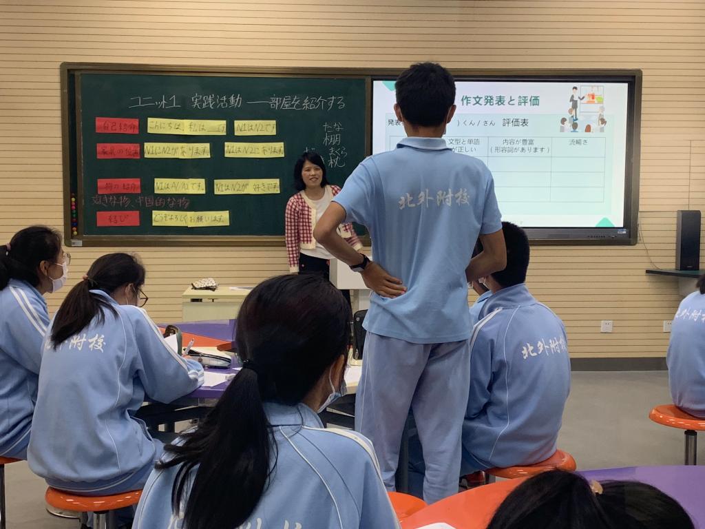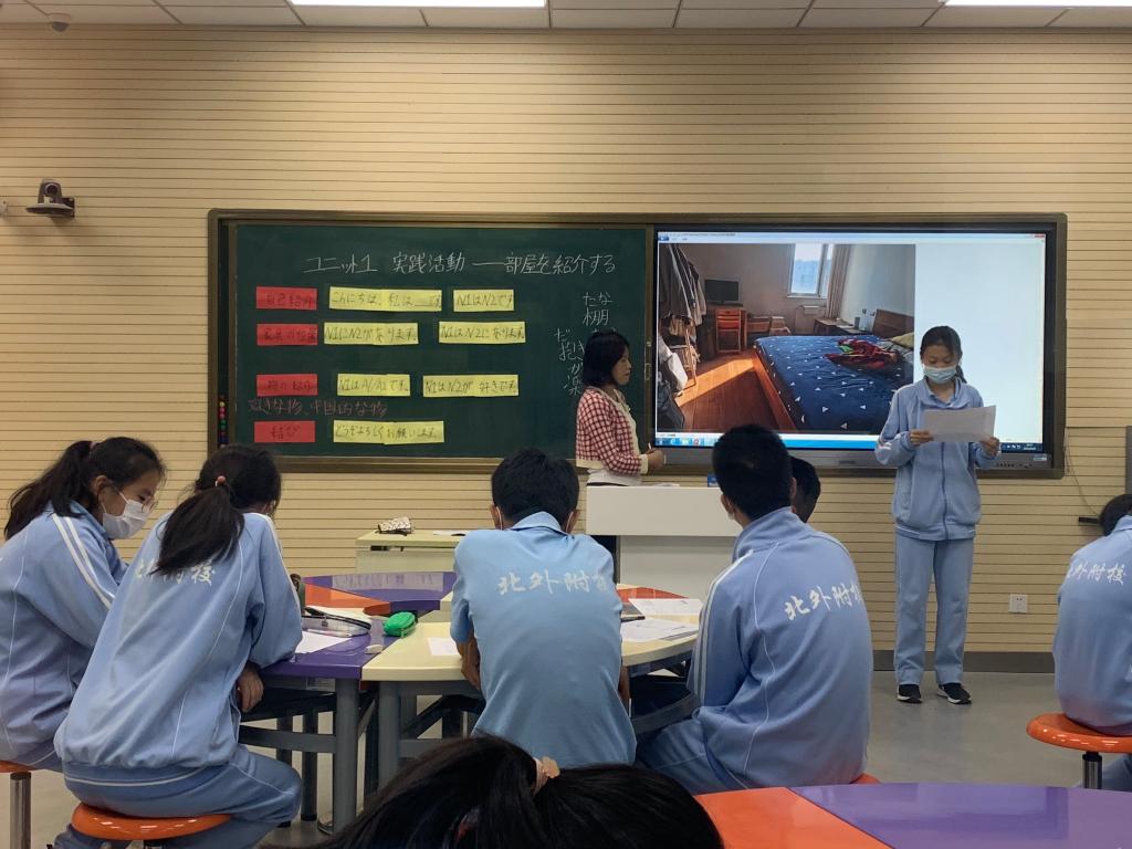 魏老师展示课的课型为写作课,主题是“介绍房间”。魏老师参照日语新课标要求,以我校独具特色的云游学活动作为背景,结合近期刚学过的表示位置与方位的句型,以情境为依托,创造尽可能真实的语境让学生开展语言任务。在写作预备环节,魏老师充分调动学生的积极性,引导学生自主发现文章结构与句型,锻炼了学生的思维能力。在最后的展示环节,学生使用自己房间的照片与心爱的物品照片,生动地介绍了自己的房间。值得一提的是,魏老师在本课中使用了“同伴互评”与“学生自评”的机制,以多元化评价方式,有效调动了学生的学习积极性,发挥了学生的主体作用。