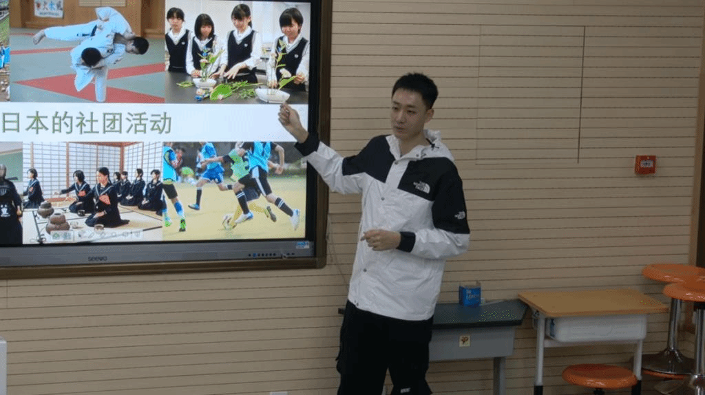 杨老师展示课的主题是“中日社团活动对比”。在课堂活动环节,杨老师首先向同学们简单介绍了中国和日本的社团活动。之后举了一些社团活动的例子,如日本有插花社,剑道部,柔道部,而我校开设了文学社,茶艺社,及齐派篆刻和葫芦雕刻等课程。他指出,中日两国在社团活动上既有相同的部分也有彼此独特的地方。最后,在课堂活动环节,杨老师设定了中日语伴交流的场景。让学生们两人一组,分别扮演中日两国学生,运用所学句型询问对方在学校参加了哪些社团,以及在社团活动中能够做什么事。学生们积极讨论,踊跃发言,充分发挥了自己的创造性思维,通过对比中日社团文化,加强了文化自信。