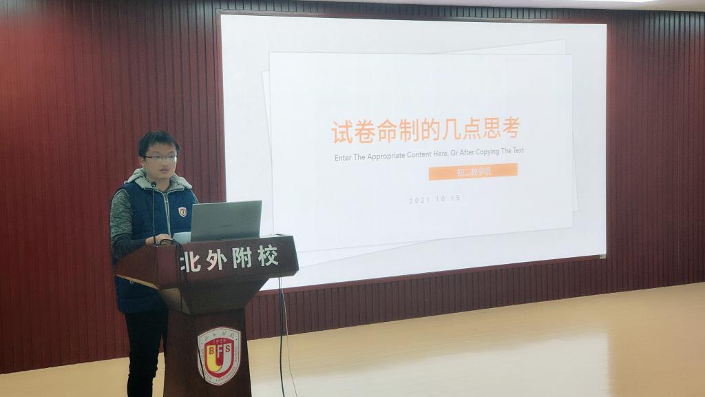 数学教师刘志鑫结合自己参与区级命题的经历和大家分享了“试卷命制的几点思考”,以数学学科为例从试卷命制和题目命制两方面进行阐述。刘老师指出命制试卷要明确考察知识点,可以通过建立三级知识体系、结合课标来命制题目。此外,还应该明确各题的考点,检查是否有重复考察。关于题目命制,刘老师从选题命制和自主命制题目两方面进行了分析。刘老师还提出要关注试卷命制难度预估,并分享了降低试题难度的几点策略。