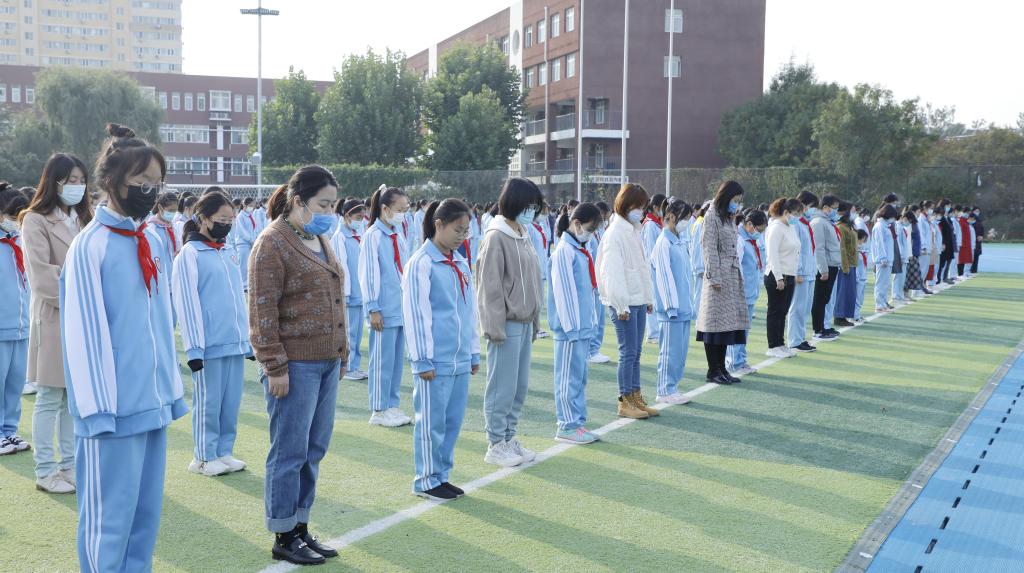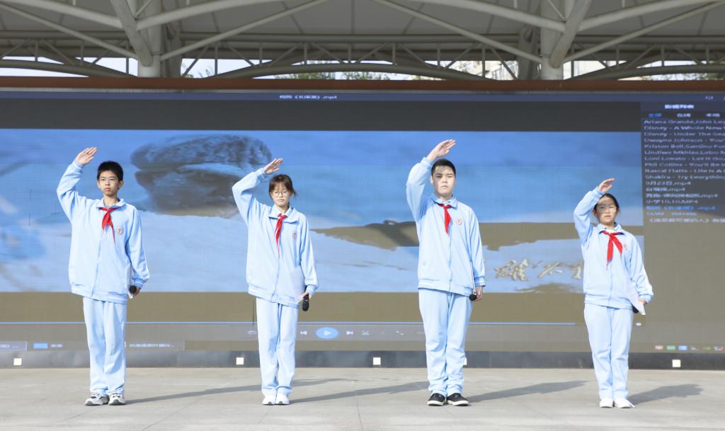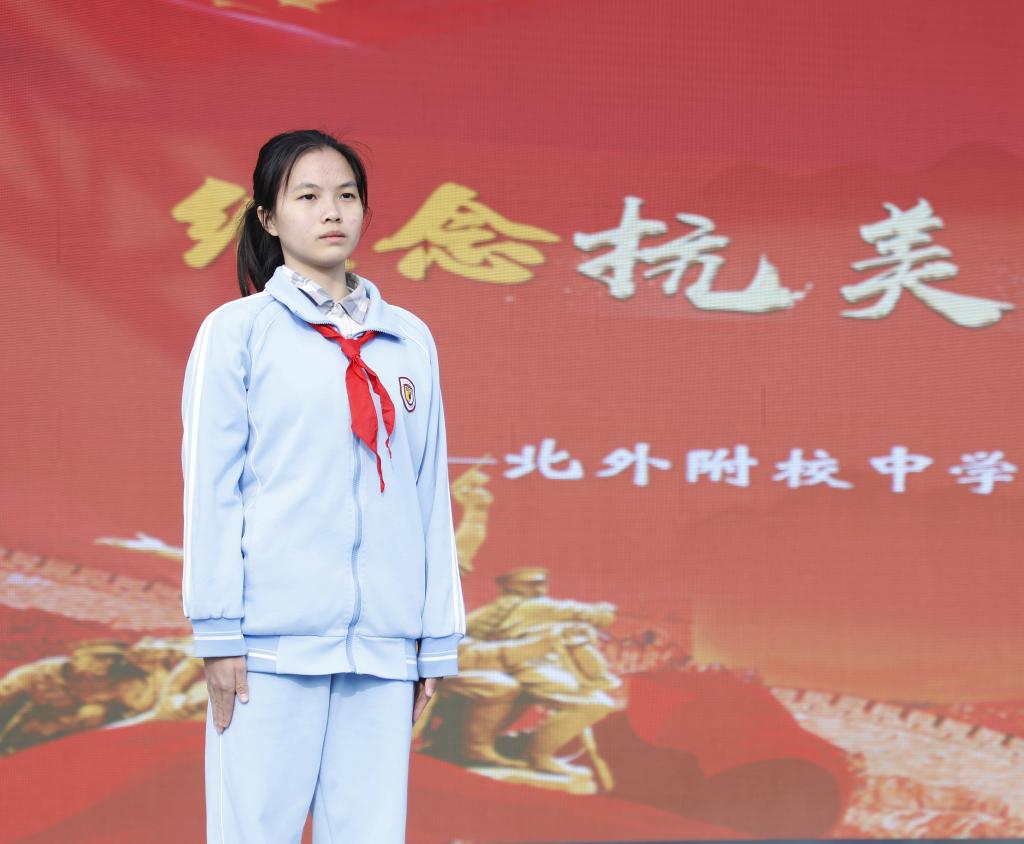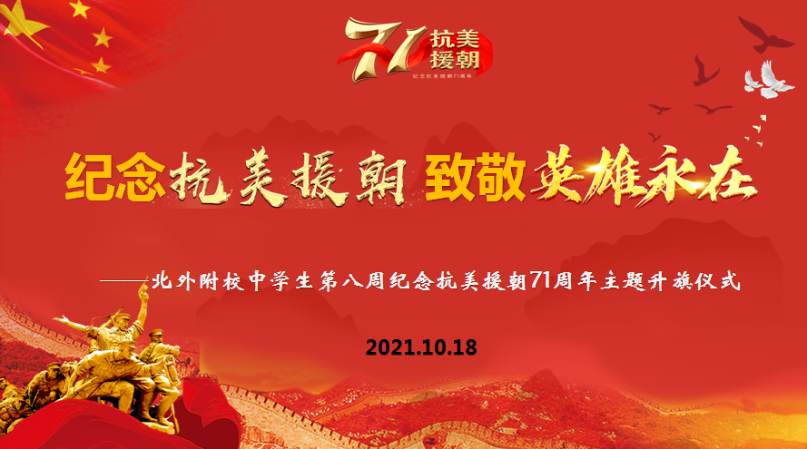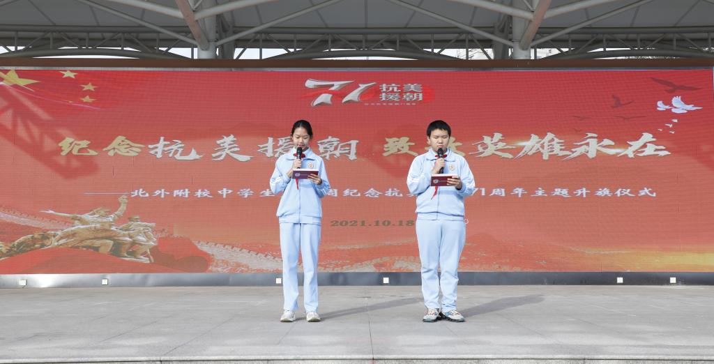 2021年是中国人民志愿军抗美援朝出国作战71周年。抗美援朝战争的伟大胜利,是书写中国人民站起来后屹立于世界东方的宣言书!为引导师生不忘历史、缅怀先烈、感恩祖国,10月18日上午,我校中学师生齐聚运动场举行主题为“纪念抗美援朝 致敬英雄永在”纪念中国人民志愿军抗美援朝出国作战71周年主题升旗仪式。共同出席升旗仪式的还有来自北外附属辽海外国语学校的校领导。初二(3)班俎珺、余诗易同学担任中英文主持人。