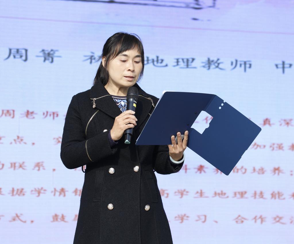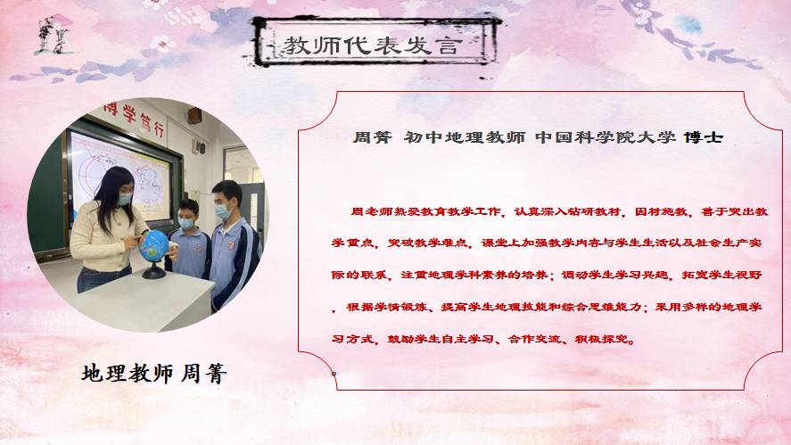 中国科学院大学地理学博士,我校初中地理教师周箐作为教师代表发言。周老师从最近热播的电影《长津湖》为切入点,引出抗美援朝战争,是一场在极不对称、极为艰难条件下顽强取胜的英雄壮举,书写了一部人类战争史上可歌可泣的壮丽史诗。在影片中很多故事情节都引发了老师和同学们的深深思考,周老师从地理学科的角度来解密这场长津湖之战。71年前,在长津湖,中国人民志愿军凭借钢铁般的战斗意志和不屈不挠的战斗精神,打出了扭转局势的关键一战,创造了抗美援朝战争中全歼美军一整个团的记录,迫使美军王牌部队经历了有史以来“路程最长的退却”。然而在这次战役中,中国人民志愿军也经受了前所未有的严峻考验。长津湖战役中,中国人民志愿军正是在零下40摄氏度严寒的条件下,以超出常人的意志,苦战20多天,艰难地取得了最终的胜利。这场战役的胜利是至关重要的,它使得志愿军在东西两线同时大捷,一举扭转了战场态势,成为朝鲜战争的拐点,为最终到来的停战谈判奠定了胜利基础。人无精神则不立,国无精神则不强。最后,周老师激励全体学生以青春、奋斗,传承并弘扬伟大的抗美援朝精神,培养爱国之情、砥砺强国之志、实践报国之行。