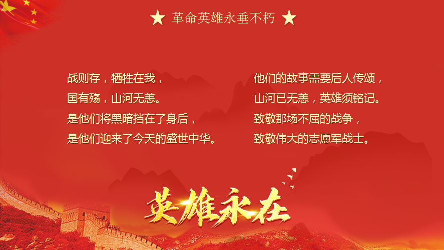 习近平总书记说:抗美援朝战争的胜利,是正义的胜利、和平的胜利、人民的胜利。抗美援朝战争锻造形成的伟大抗美援朝精神,必将激励中国人民和中华民族克服一切艰难险阻、战胜一切强大敌人。崇尚英雄才会产生英雄,争做英雄才能英雄辈出。抗美援朝战争是一段历史回忆录,更是精神备忘录。在现在的美好时代,愿我们每一个人都能够传承英雄精神,担负时代使命。努力成长为能够担当民族复兴的建设者和国家安全的捍卫者,为实现中华民族伟大复兴而奋斗!