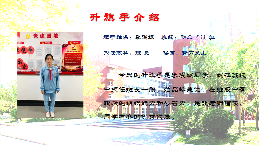 今天的升旗手是李漫妮同学。她在班级中担任班长一职。她品学兼优,在班级中有较强的组织能力和号召力,是让老师信任、同学看齐的对象。