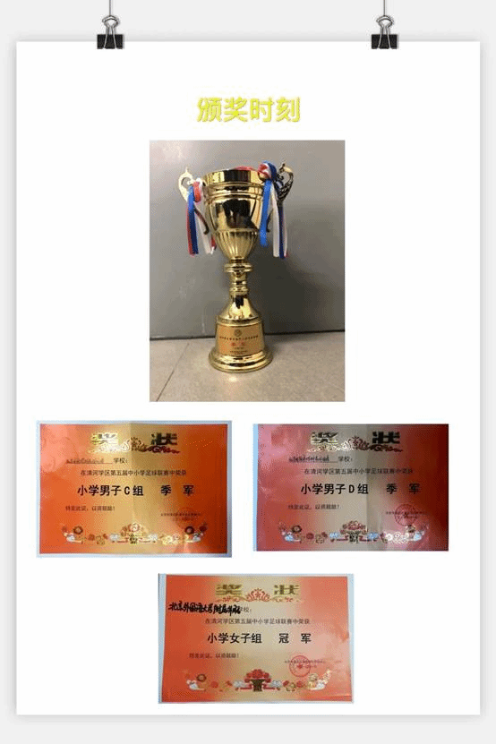 在清河学区第四届中小学生足球赛中,我校足球队一路过关斩将,勇获甲组冠军,乙组季军,成功跻身于清河学区强队行列。2021年我校男足、女足一起参加了海淀区超级杯足球联赛小学组比赛,两队双双突围,挺进16强。
