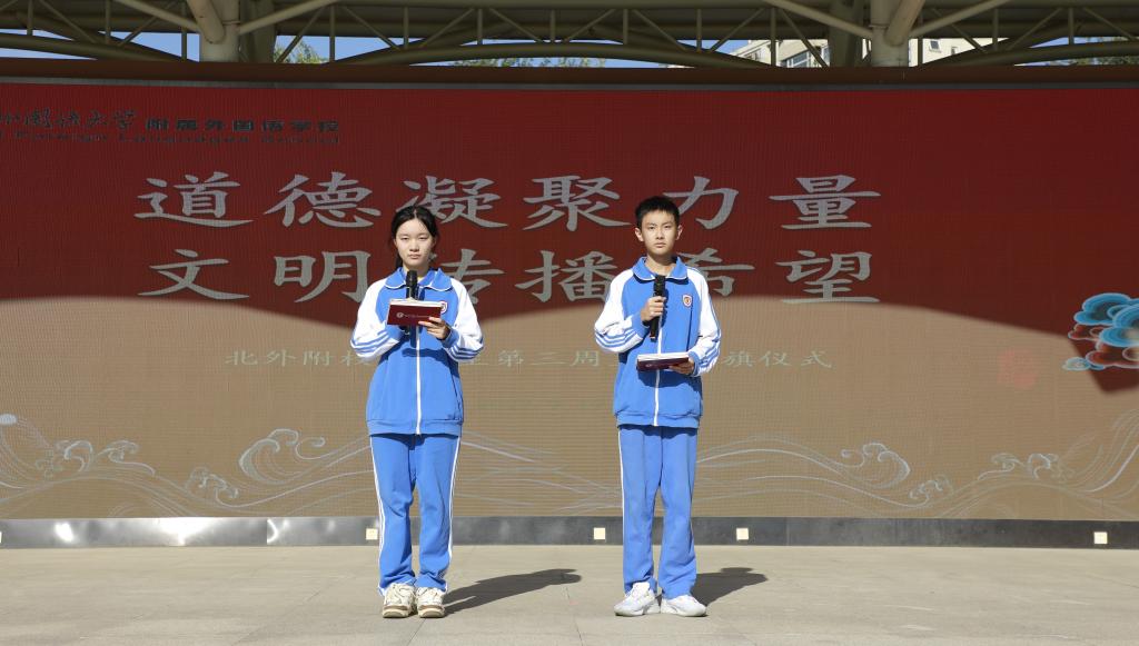 道德引领时代风尚,文明促进社会和谐。在9月20日我们将迎来第20个公民道德宣传日。借此机会,北外附校中学生于2022年9月19日在运动场举办了以“道德凝聚力量,文明传播希望”为主题的升旗仪式。本次负责升旗仪式的是高二(6)班,凌闻秋同学担任升旗手,焦芊妮、傅锦泉担任中英文主持。