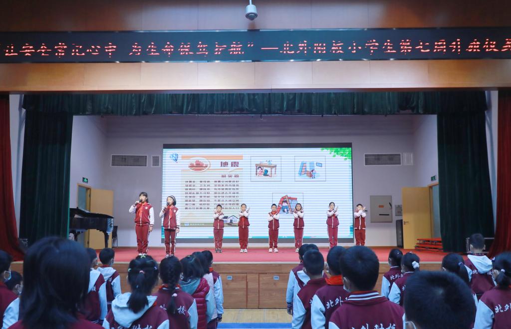 紧接着,来自四年级的王怡然、戴贺一、汪嘉潜、张子柠、孙彤昕、肖梓阳、谷承泽、崔羽彤八位安全小卫士通过情景模拟的形式,分别从地震、火灾、雷电、暴雨四个方面为我们介绍了面对自然灾害时的安全自救小技能。