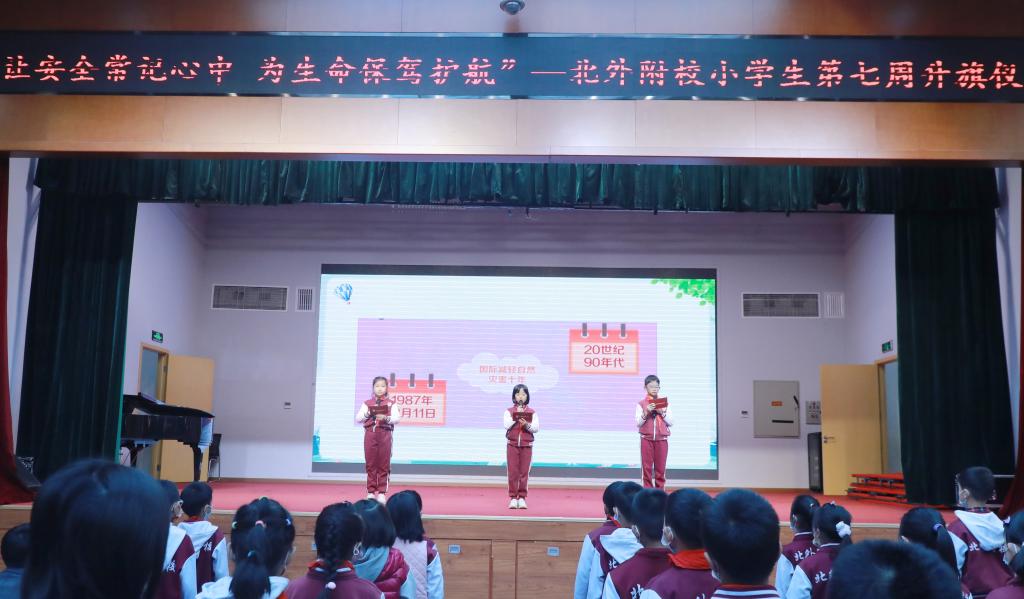 自然灾害是当今世界面临的重大问题之一,严重影响经济、社会的可持续发展和威胁人类的生存。为增强学生防灾减灾意识,提高避灾自救技能。10月10日上午,我校开展了以“让安全常记心中,为安全保驾护航”为主题的小学生第7周升旗仪式。活动由六(1)班刘佳宁和六(8)班吴瞳双语主持。受大风天气影响,本次升旗仪式在室内进行。