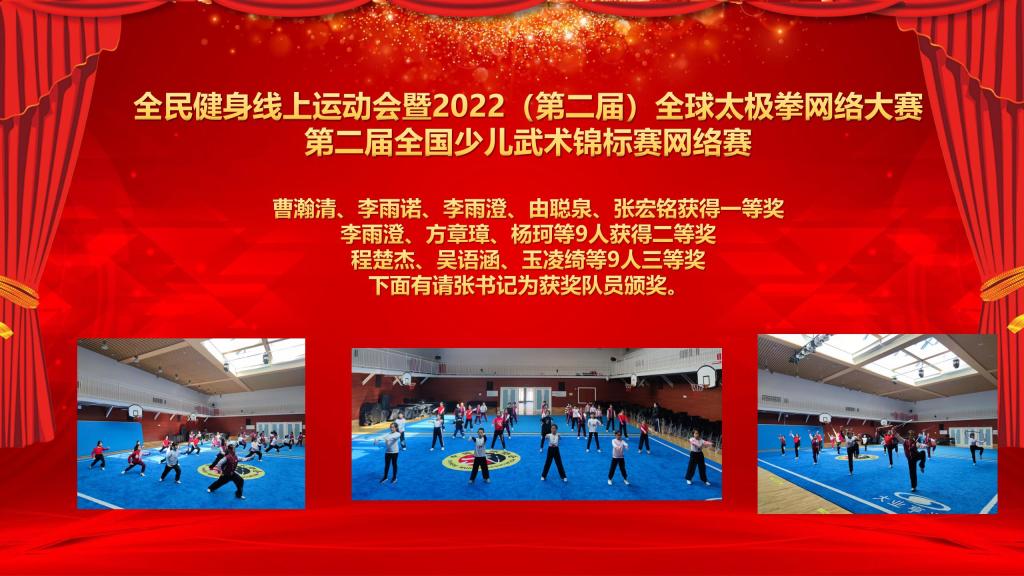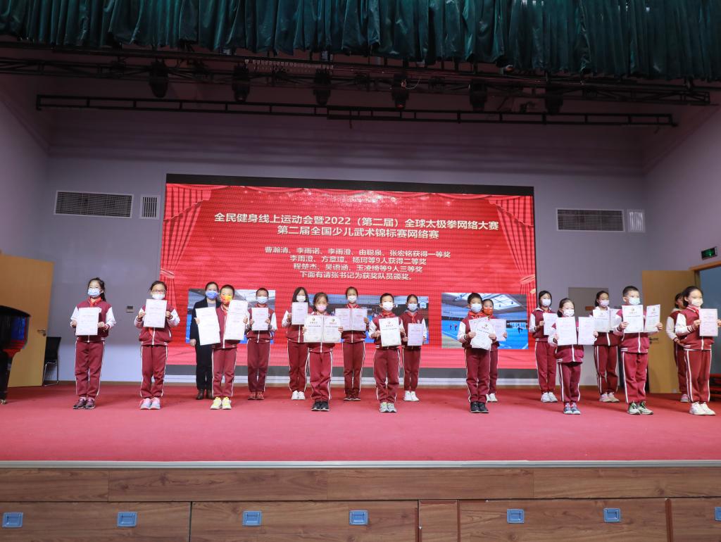 升旗仪式最后,我校党总支书记、小学校长张继军为我校鹏鶱武术队的队员们颁奖,他们以优异的成绩在刚刚落下帷幕的全民健身线上运动会暨2022(第二届)全球太极拳网络大赛和中国武术协会举办的第二届全国少儿武术锦标赛网络赛中斩获一、二、三等奖。虽然是线上比赛,但队员动作流畅、刚柔并济,依然展现出意气风发的优良体育作风。