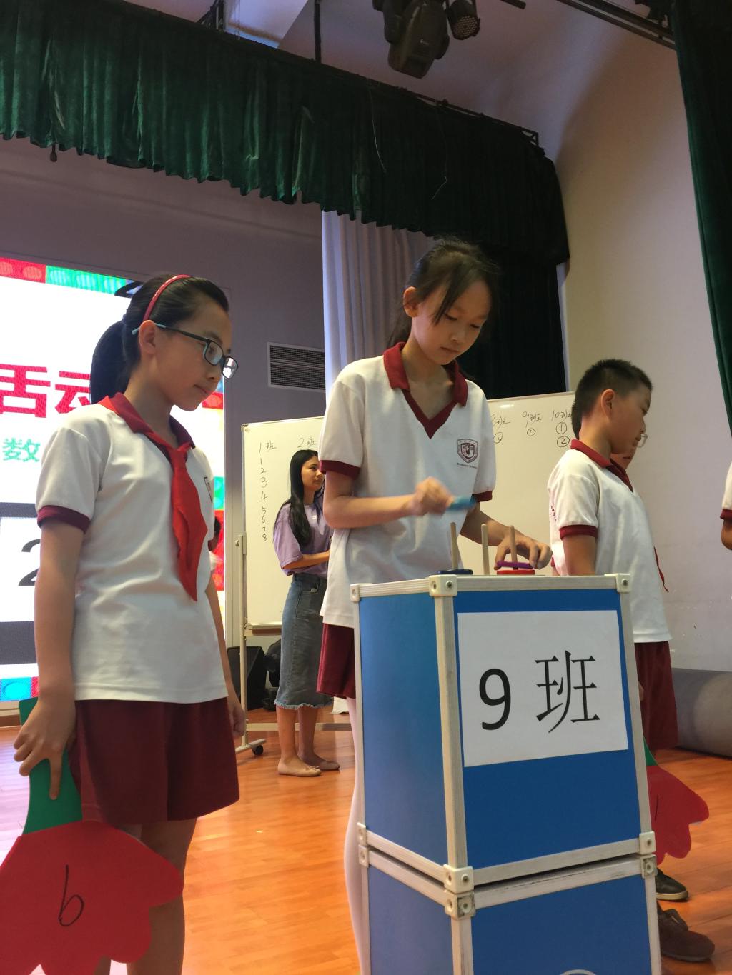 此次活动利用课间操时间在国瑞厅举行,全体四年级同学参加。每班的10位参赛队员在老师的组织下有序候场,8分钟时间内接龙完成比赛。值得一提的是,每班派出的小裁判员手执红绿牌子,通过即为绿牌,犯规则红牌罚下。参赛队员紧张备战,台下的观众们屏息以待,认真观赛。最后,比赛在孩子们的加油和欢呼中结束。