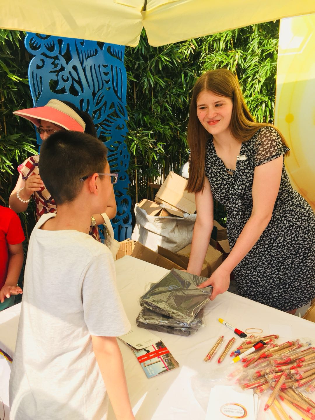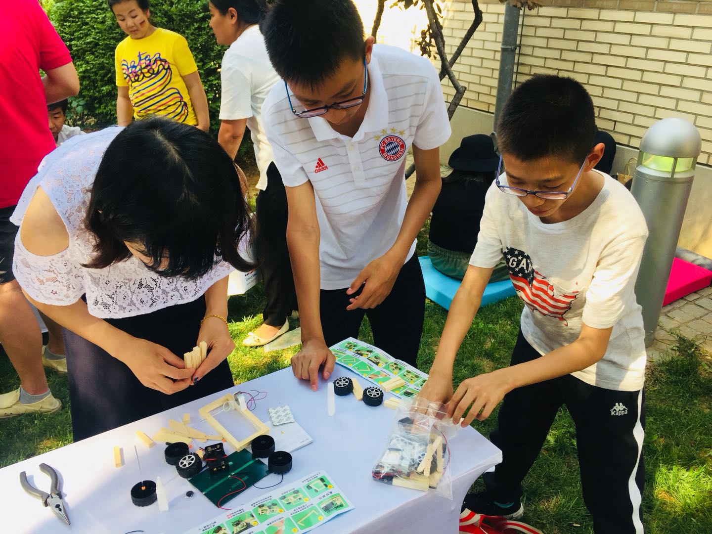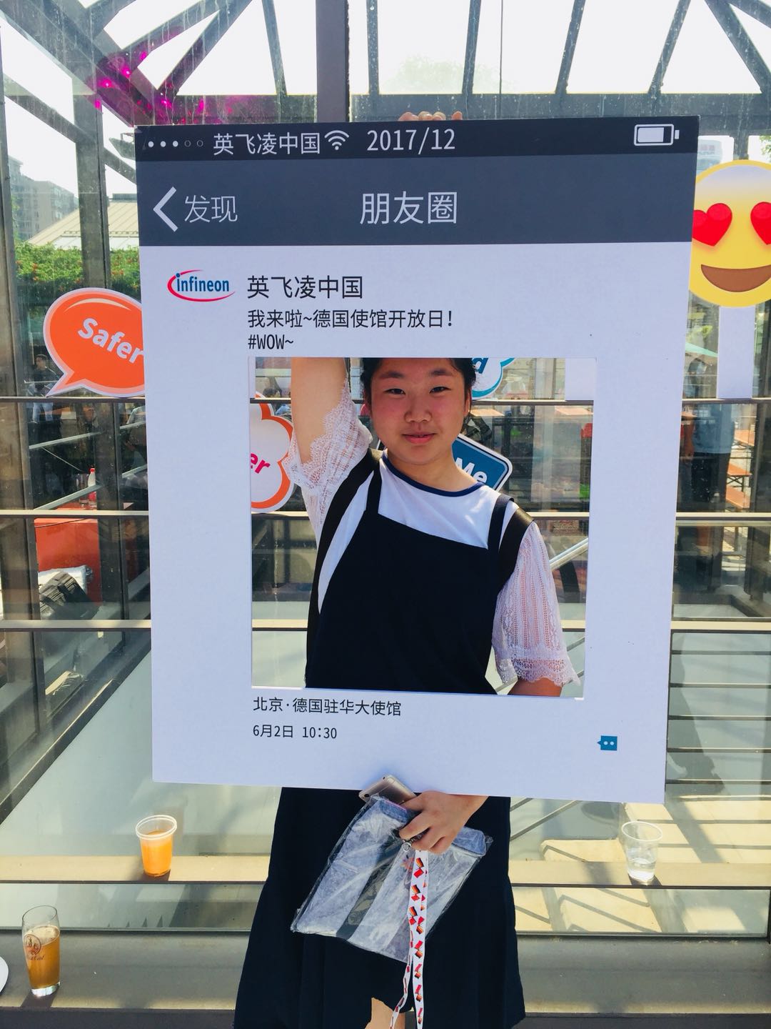 So glücklich war ich in der Botschaft in Peking. Das hatte ich viel Spaβ. Dort kann man gut essen und so viel machen. Ich habe viele Technologie Exponate gesehen, und finde sie ganz toll! Ich habe auch köstlicke Bissen gegessen. Im Garten hinter der Botschaft habe ich ein kleines Auto gemacht. Das kann sehr schnell fahren! Ich finde deutsche Technik wunderbar! In der Znkunft würde ich auch an dieser Aktivität teilnehmen.(非常荣幸能够作为学生代表来到德国大使馆参加开放日活动。在这里,我度过了非常开心的一天。人们可以在这里享用德式美食、参观德国工艺。我见到了很多德国高科技产品,简直太赞了!我也品尝了一些味道非常不错的点心。在使馆后花园里我还动手制作了一辆太阳能小车,并且实验成功,我感到十分开心和骄傲。未来我希望还能够参加德国使馆的文化开放日活动。)