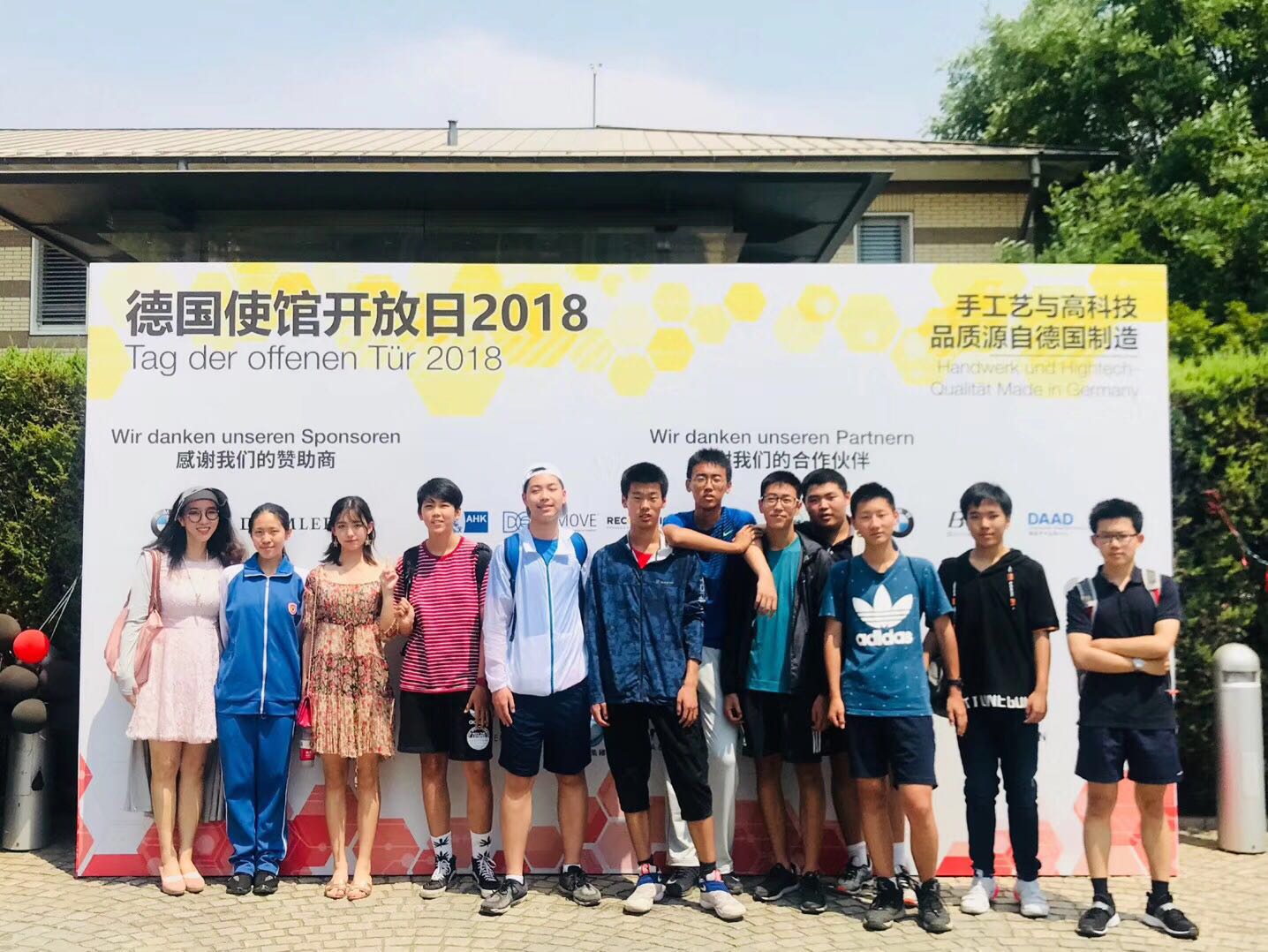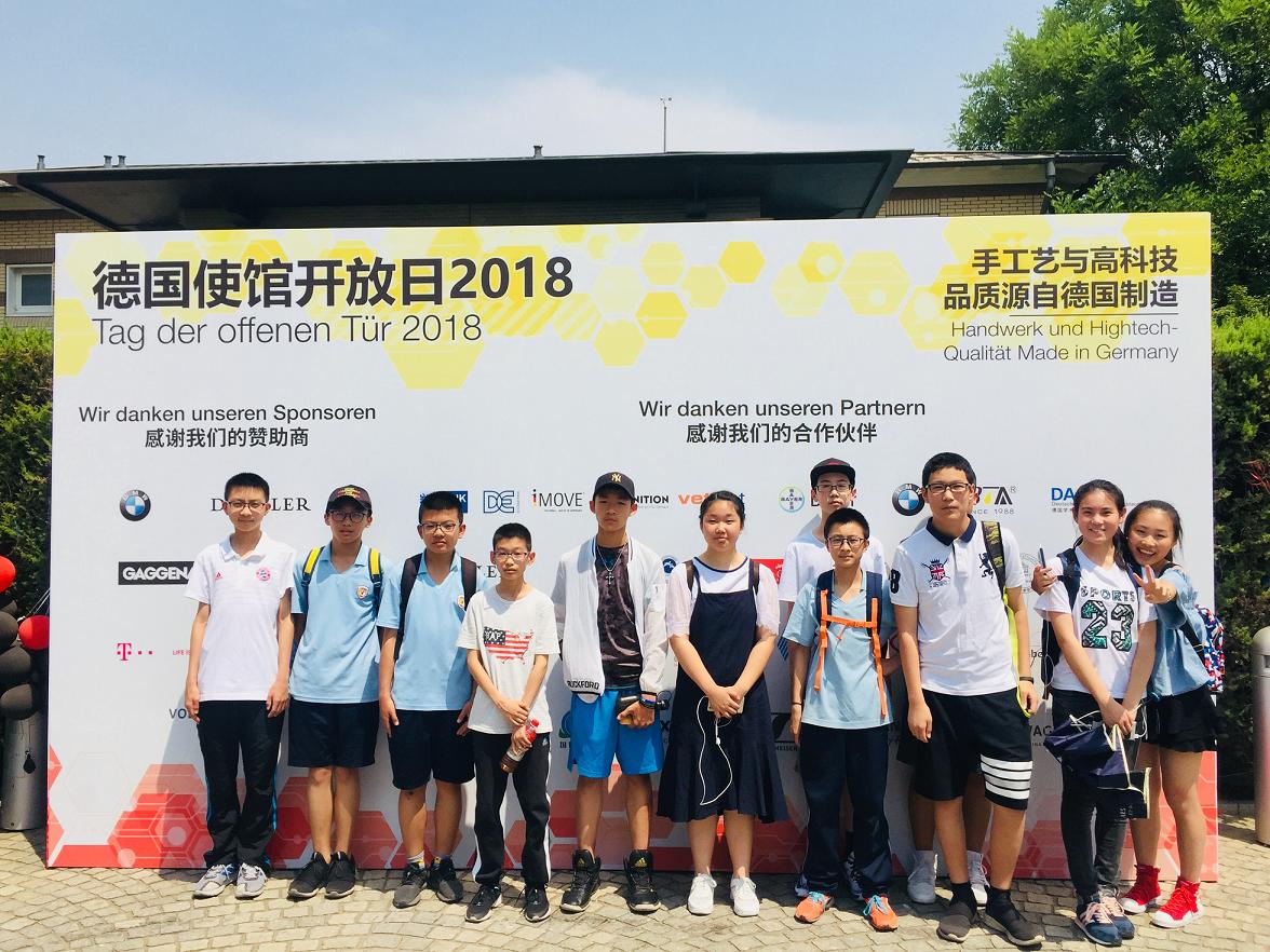 6月2日,一年一度的德国使馆文化体验日活动在众多“德粉”的期待下终于来临啦!今年的开放日,德国使馆倾情推出:“手工艺与高科技—品质源自德国制造” ( Handwerk und Hightech – Qualit t Made in Germany“)这一主题。我校初一、初二、高一、高二年级德英复语班26名学生代表在德语教师刘志欣和潘铎轩老师的带领下受邀参加了此次活动。