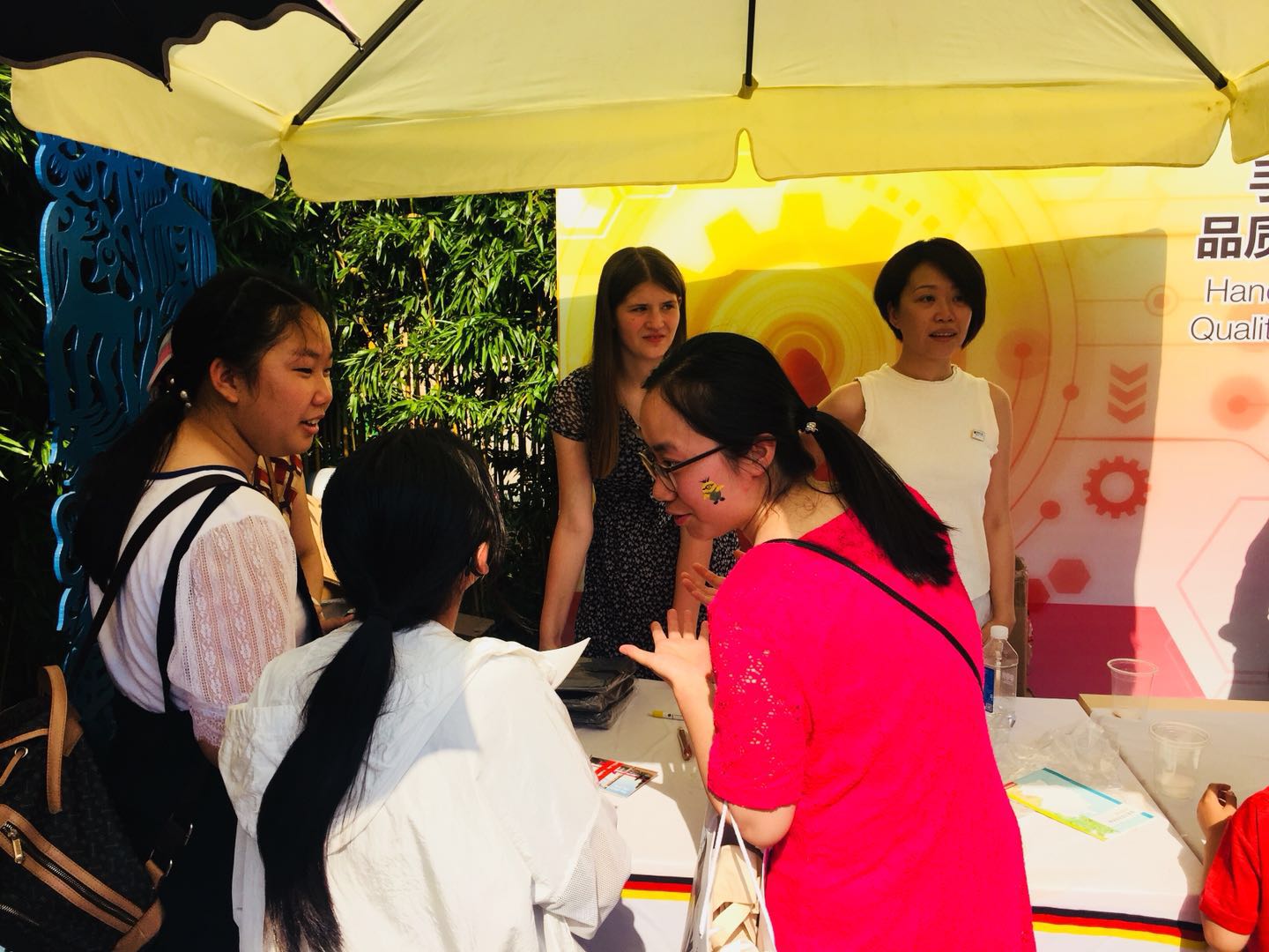 开放日活动上,德国知名企业和机构设置了富有科技创新特点的展台。戴姆勒公司(Daimler)展示了最新创新设计—汽车翻转模拟器,同学们参与模拟实验并从“翻车”中体会汽车安全和行车安全;博世公司(BOSCH)展示了中华传统工艺—鲁班锁,同学们在展台前凝神组装,锻炼智力也磨砺耐性;西门子公司(Siemens)展示了西门子工业制造的生产线,同学们从模型中感受到了德国机械制造的严谨和细致。此外,体验德国啤酒酿造,动手建座德式木屋,观摩3D打印、德国服装设计展示、德国星级厨师的厨艺大秀等活动环节都吸引了同学们的积极参与。在活动期间,同学们也勇于大胆开口说德语,主动与德国大使和官员介绍自己、介绍学校,流利自信的口语表达赢得了德国使馆工作人员的掌声与表扬。