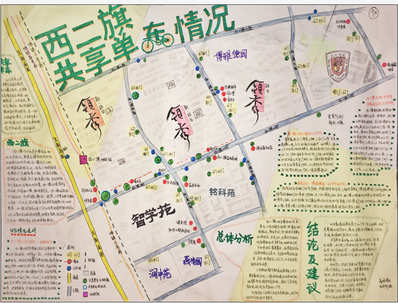 在2017年10月“中图杯”第十四届中国环境地图竞赛近2000多份作品中,我校高咏薇同学的作品——《西二旗共享单车情况》脱颖而出,荣获该项比赛高中组一等奖,于闰玲老师获优秀指导教师奖。