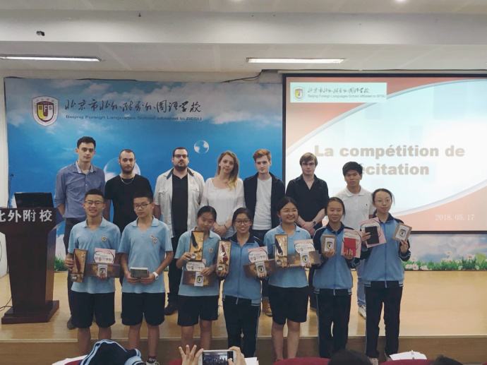 此次比赛我校还请来了北京交通大学的六位法国留学生作为评审团,评委们根据参赛选手的情绪表现力、流利度、发音准确度、观众互动等诸多细节对学生的朗诵进行打分,最终评选出六名优胜者及一名特殊表现奖。