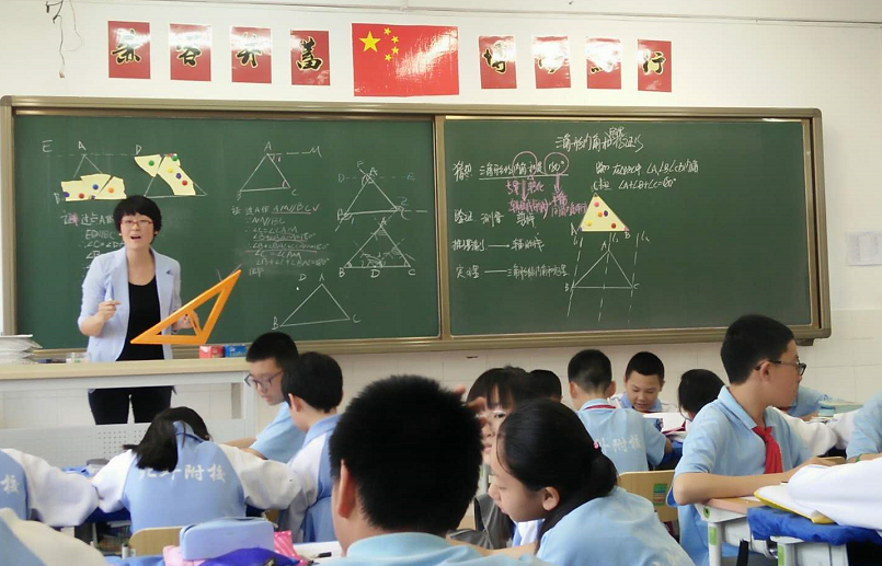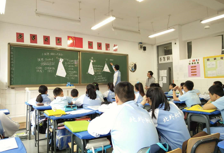 本次教学活动由卫霞老师和刘志鑫老师分别针对A层与B层班级执教授课——《三角形内角和定理的证明》,课堂主线从猜想——验证——推理证明——定理形成——应用准确清晰,两位老师都能够基于学情合理的设置了教学目标,A层重在数学研究方法的引导和深层次地数学思维的启发和应用;B层重在推理的发现和规范的推理证明及三角形内角和的代数计算的落实与应用。学生积极发言讲解,多种方法不断涌现,展现了北外附校学子的风采。