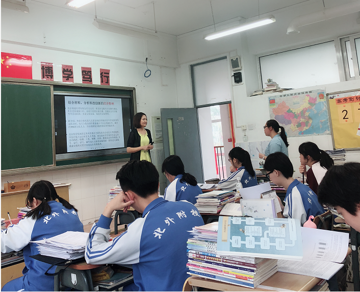 5月11日第3节课,高中政治组程长丽老师在高三(3)班开展了主题为《基于学科能力提升的二轮专题复习》研究课,本节课是一节高考二轮复习课。北京高考政治学科常把热点材料作为试题载体,借此考察学生学科知识及相关能力,强调立意、素养导向,注重价值感的引领。根据高考的这一特点,政治组尝试在高考复习课中,围绕政治组 “思想政治课卷入式设问的研究”这一课题,实践与新课程改革相适应的高考复习思路。