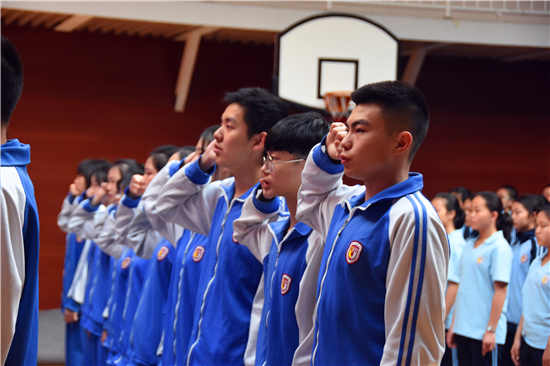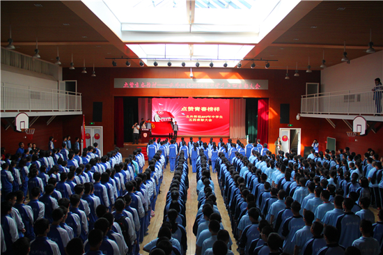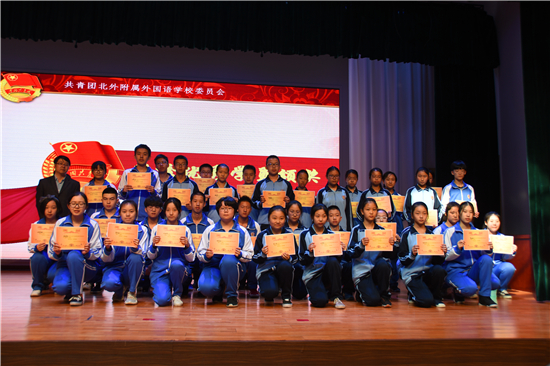 今天是五四青年节,也是“五四”运动99周年纪念日。主持人社团成员以一首配乐诗朗诵《青春赞歌》,为五四表彰大会揭开了序幕。团委书记刘志欣宣读《关于批准胡维娜、李泽睿等47名学生加入中国共产主义青年团的决议》,初二年级胡维娜等22名学生,高一年级乔子彤等15名学生,高二年级杨子涵等10名学生,通过少年先锋团校结业考试,正式加入中国共产主义青年团。中学全体新老团员在团委副书记高咏薇的带领下重温入团宣誓誓词。接下来,高咏薇同学宣布了2018年度少年先锋团校团歌学唱比赛、优秀团校学员名单。校长助理杨磊、团委书记刘志欣为获奖学生颁奖。优秀团校学员代表高二(4)班朱梓萱上台发言。她号召所有新团员努力使自己成为一个高尚的人,成为一名优秀的共青团员,在学习与实践中起模范带头作用,用热情去带动和影响周围的同学,用青春谱写绚丽的篇章。