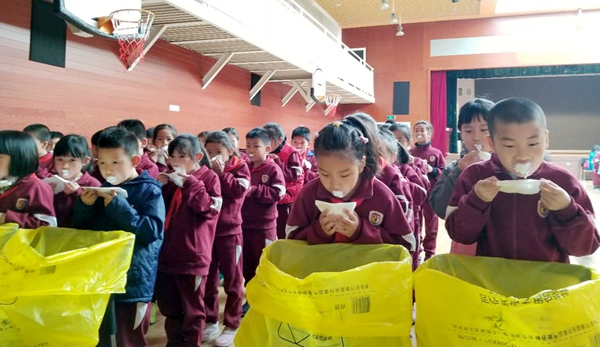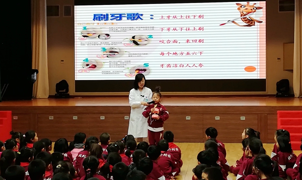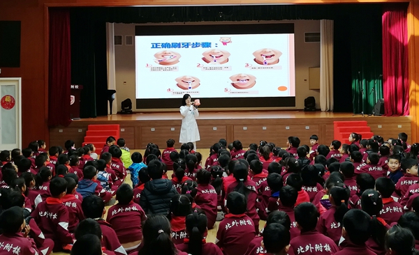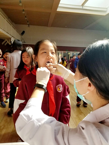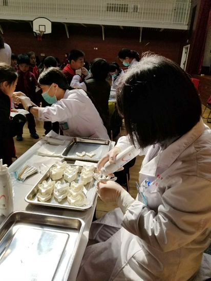 2018年4月12日9:00,海淀区卫生保健中心牙防工作组由陈素芬老师带队8位医生,到我校为小学1-3年级学生在国瑞厅进行氟化泡沫护齿工作。