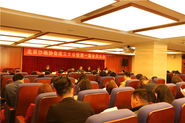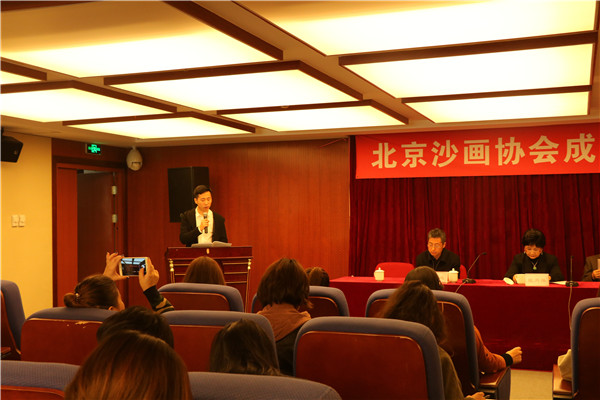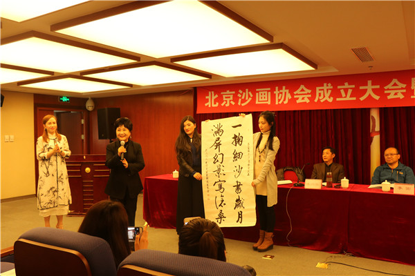 北京市文学艺术届联合会事业发展部处级调研员刘淑成宣读《北京市文联业务主管单位关于同意筹备成立北京沙画协会的批复》并代表北京市民政局宣读《成立工作告知单》。沙画协会筹备工作组组长王义同志做筹备工作报告,从协会成立的背景和开展筹备活动的有关情况等方面来汇报。北京市丰台区文联副主席、戏剧家协会主席,北京市政协九届、十届政协委员,十一届特邀委员戴月琴女士在会议中指出“沙画艺术深受广大人民群众的认可与喜爱,极为广阔的市场空间有待开发,目前沙画领域还属于初级发展阶段并正处于飞速增长时期,北京作为祖国的首都,也理所当然成为沙画领域发展的核心区与示范区”,最后送上一份特殊的大礼,由原国务院总理李鹏同志撰、戴月琴女士书写的“一掬细沙书岁月,满屏幻影写沧桑”墨宝。