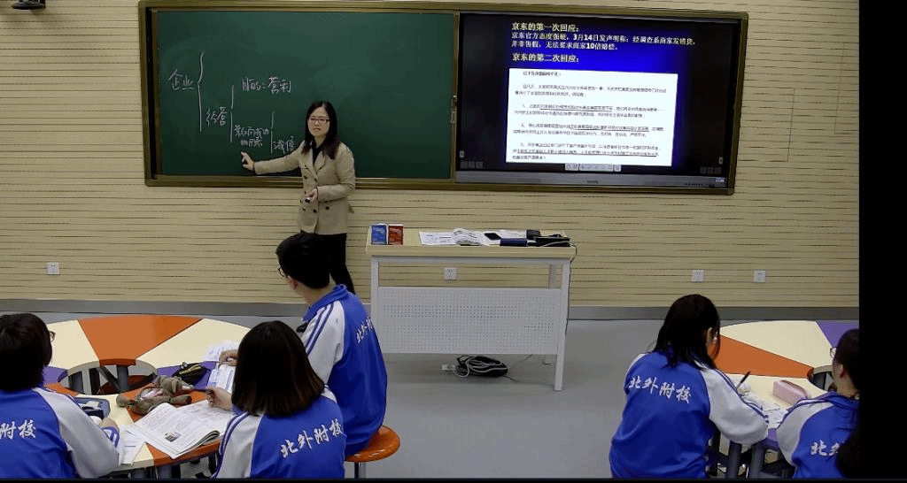 冯老师这节课的整体思路是:以学生熟悉的企业—“京东”的经营相关事例作为主线,通过一系列的情景卷入设问,让学生在解决问题的过程中提升分析解决社会生活实际问题的能力,落实本课的基础知识,提升解题能力。同时冯老师借助情景卷入,生动形象的帮助学生构建知识框架,让学生加深对会考相关知识的理解,帮助学生转变政治学科会考就是死记硬背的观点,在审题环节,让学生参与其中,根据学生的弱点进行了有针对的解题指导。