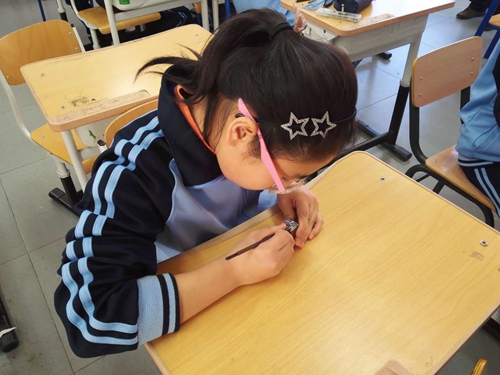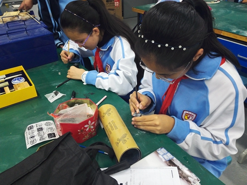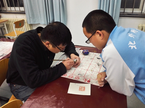 我校自2015年6月被批准为海淀区非物质文化遗产传承项目实验校以来,初中校区校本选修课先后引入两门非遗课程——齐派篆刻和葫芦雕刻。在教委和海淀非遗办的大力支持下,齐派篆刻已经在我校开设两年,齐白石先生的传承弟子郑忠强老师每周来我校学生授课,同学们学习篆刻的热情日益高涨,郑老师每周面对面、手把手地教授篆刻传统技艺,已经培养了三届初中学生,让同学们不仅学习了传统手工艺,技艺之美也激发了学生对篆刻艺术的热爱。