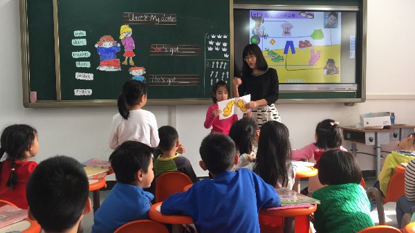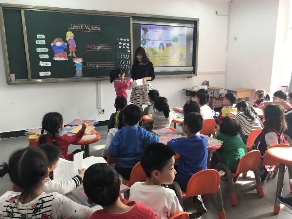 这节课中,任老师以“学生作为主体”,首先以孩子们齐唱大家熟悉的英文chant来开始这节课,大屏幕上的动画吸引了孩子们的注意力,立刻使得孩子们快速的进入到英语语言环境中。随后,她打开了自己制作的精美PPT课件,和孩子们一起回忆了上节课所学的单词——clothes系列。一幅幅衣服的图片从屏幕的各个角落“蹦”出来,孩子们仔细的观察并回忆着与图片相应的单词,很快的就记起了上节课曾学习的单词。随后,任老师为了再次巩固孩子们上节课所学的内容,她用“词条匹配图片游戏”的形式,让孩子们举手上来匹配,把每一个词条放在相应的图片上,孩子们积极的配合着,“玩”的不亦乐乎。复习完了单词,任老师拿出了孩子们在课本中最喜欢的两个人物的头像:Stella和Simon,让他们来为两个人物“穿衣服”,孩子们兴奋的举着小手,争当小小“设计师”。当然在孩子们为人物穿好衣服时,任老师也不忘引导孩子们说出He / She’s got…句型。后面还加入了认领“Magic Box”环节,神奇的盒子里有许多和一年级孩子身材大小差不多的clothes,这也恰恰体现出任老师在设计这个教学环节的细致与认真。这个游戏就是用来做“group working”的。整个教学环节一环扣一环,过渡自然;每个环节也非常清晰,在过程中,教句型的部分大概花了15分钟左右,余下的时间进行了各种趣味操练,让孩子们得到更多的时间练习。