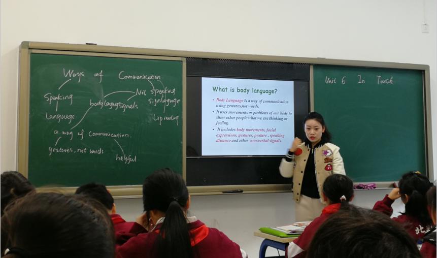 接下来,学生们带着两个问题盲听文本音频,有意识地捕捉关键信息“What is body language?”“Why people use body language?”,在对文本有了基本了解后,王爽老师鼓励学生们利用自己肢体语言来表达不同的意思,感受肢体语言在实际沟通的应用。然后学生们认真阅读文本,并思考“What does it mean when someone puts the thumb up?”“What does it mean when somebody nods his or her head up and down”,了解特定肢体语言在不同国家的不同含义。通过观看一个关于肢体语言的视频,让学生们了解同一肢体语言在不同国家的多样表达形式。最后,为了使学生们更加深刻理解肢体语言蕴含的文化差异,并实现顺利的跨文化交际,王爽老师让学生们围绕不同国家问候的方式,利用肢体语言进行表达与猜测。在生动有趣的表演和竞猜过程中,孩子们理解了肢体语言这一非语言沟通方式与每一个国家的文化息息相关,也意识到今后要更加谨慎合理地使用肢体语言。