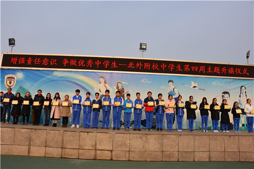 初三年级市级三好学生代表作《增强责任意识,争做优秀中学生》主题发言。人在社会中生存,就必然要对自己、对家庭甚至对祖国承担并履行一定的责任。责任便是能够遵守规范,履行义务,做好自己分内的事。当代中学生作为一个公民,要具备社会道德、公共道德;作为一个学生,要遵守校规校纪,学有所长;作为子女,要懂得孝敬父母。人的身份有很多种,无论以何种身份出现,都要尽好身份责任。她呼吁每位同学,作为一名北外附校的学生,可以从生活当中的点滴小事做起。播下一个动作,便收获一个习惯;播下一个习惯,便收获一个品质。每个人的举手投足之间都传递着丰富的文明与内涵。这些都是同学们自身良好素质的体现,也都是作为北外附校的学生对学校对社会应尽的责任。