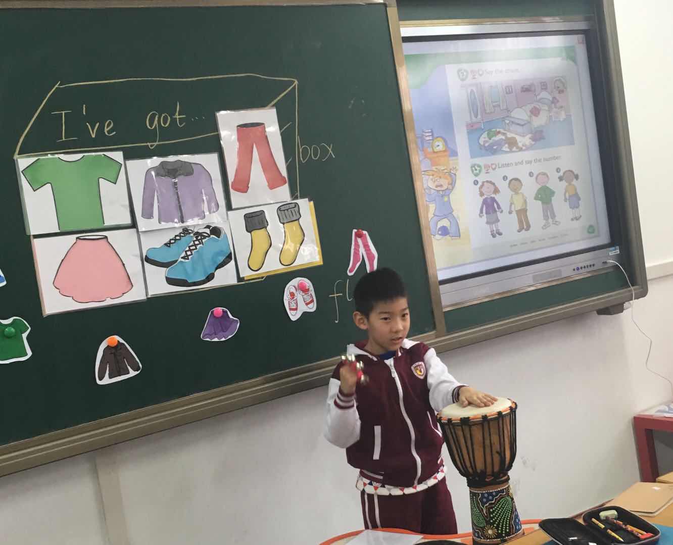 最后,肖冰老师设计了有效的小组听力活动,导入并学习了本课的韵律歌谣。由于英文歌谣的韵律性强,加之一年级孩子活泼好动,肖冰老师将音乐鼓点的元素融入了英文的课堂。孩子们与老师共同边演奏韵律鼓点,边说出英文歌谣,孩子觉得此方式新鲜有趣,跃跃欲试!