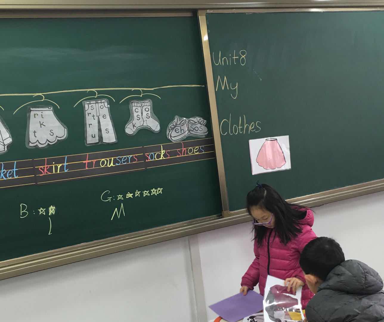 此课选自Kid’s box Unit8 Activity3 chant。 本单元的主题为My clothes。关于服装的词汇:T-shirt, skirt, trousers, shoes, socks, jacket为本课的基础词汇。首先,肖冰老师用自然拼读的方式导入基础词汇,在强化单词发音的同时,让学生对单词的拼写方法有了初步的认知。随后,肖冰老师引导学生以镂空的衣服图片及不同颜色的彩纸创造出学生自己喜欢的衣服,并尝试用英文表达喜好,练习颜色+衣服的短语,例如:a pink T-shirt, blue trousers.