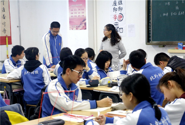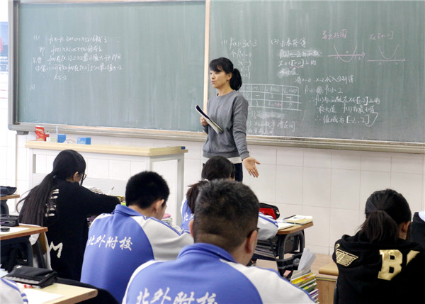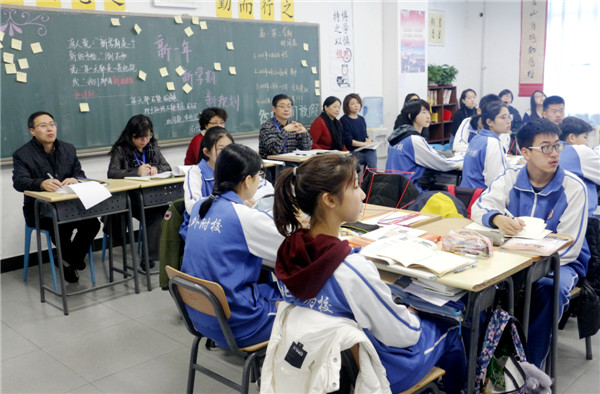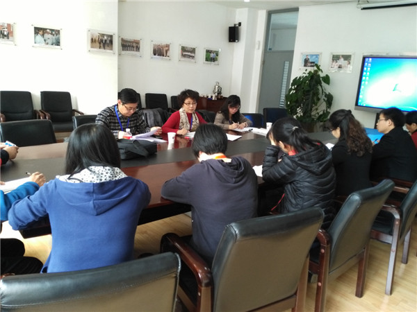 之后,专家们与高中数学组全体老师进行交流。田媛针对学生调查问卷的统计结果和她自己的听课感受,充分肯定了我校高中数学教研组朝气蓬勃、充满活力的精神状态,肯定了教师们良好的个人素质,认为授课教师能够结合学情调整教法,教学讲求实效。各位专家同时也建议年轻老师要注重社会主义核心价值观教育,树立起“终身学习”的理念,在自主专研、互相听课、集体教研活动中扎实提高业务水平。