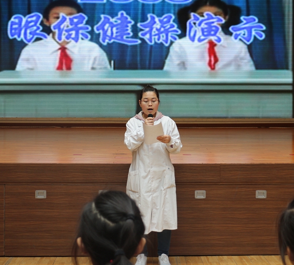 校医李雪为同学们分步解析并演示眼保健操的标准动作,在缓慢轻柔的音乐中同学们认真的做眼保健操,对动作不够标准的同学给予指正,同时挑选几位动作标准的同学来到队伍中督导其他学生,班级骨干通过这次的学习,植入班级指导学生能够标准的来做眼保健操。常做眼保健操,可以通过对眼部周围穴位的按摩,使眼内气血通畅,改善神经营养,以达到消除睫状肌紧张或痉挛的目的,起到保护视力、防治近视的作用。