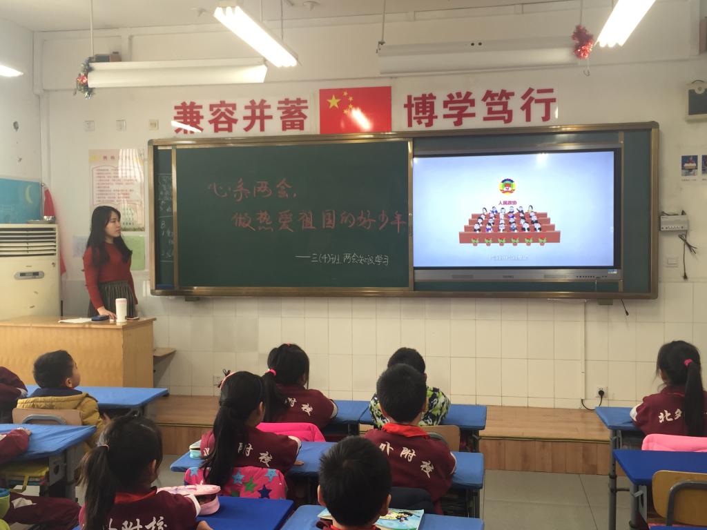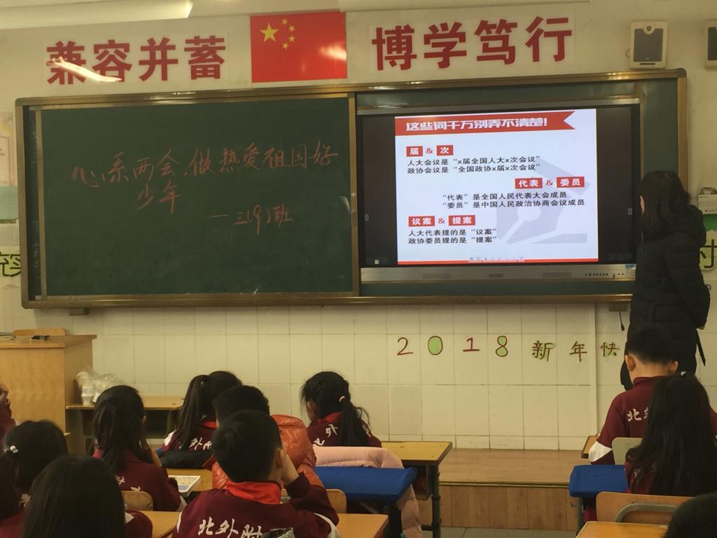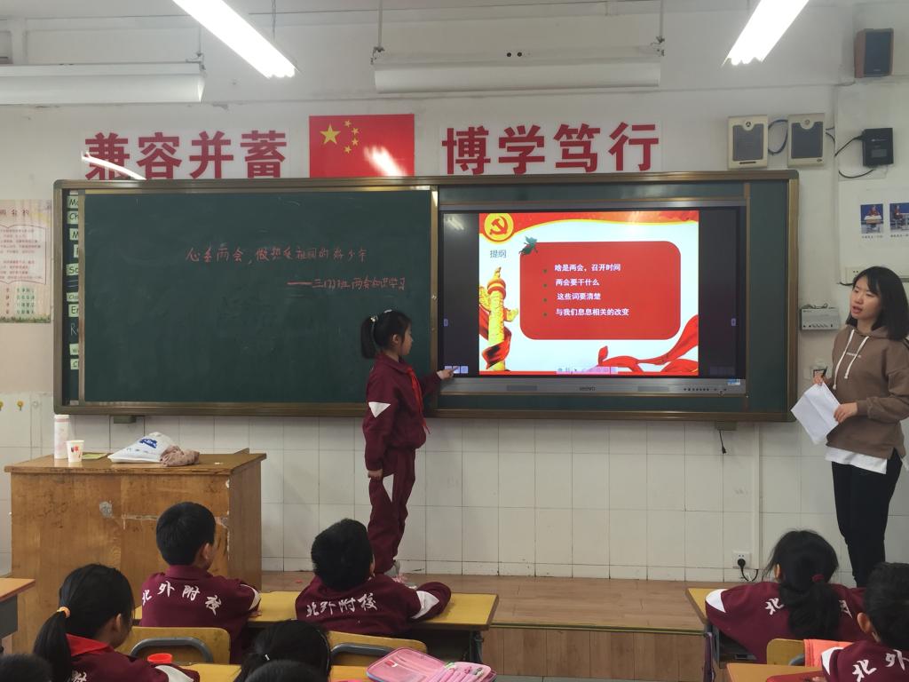在少先队活动课上,各中队通过多种方式了解“两会”召开时间、“两会”关键词、“两会”会徽及相关知识、“两会”议事程序、“两会”与我们生活的联系、“两会”与儿童相关的提案等等。