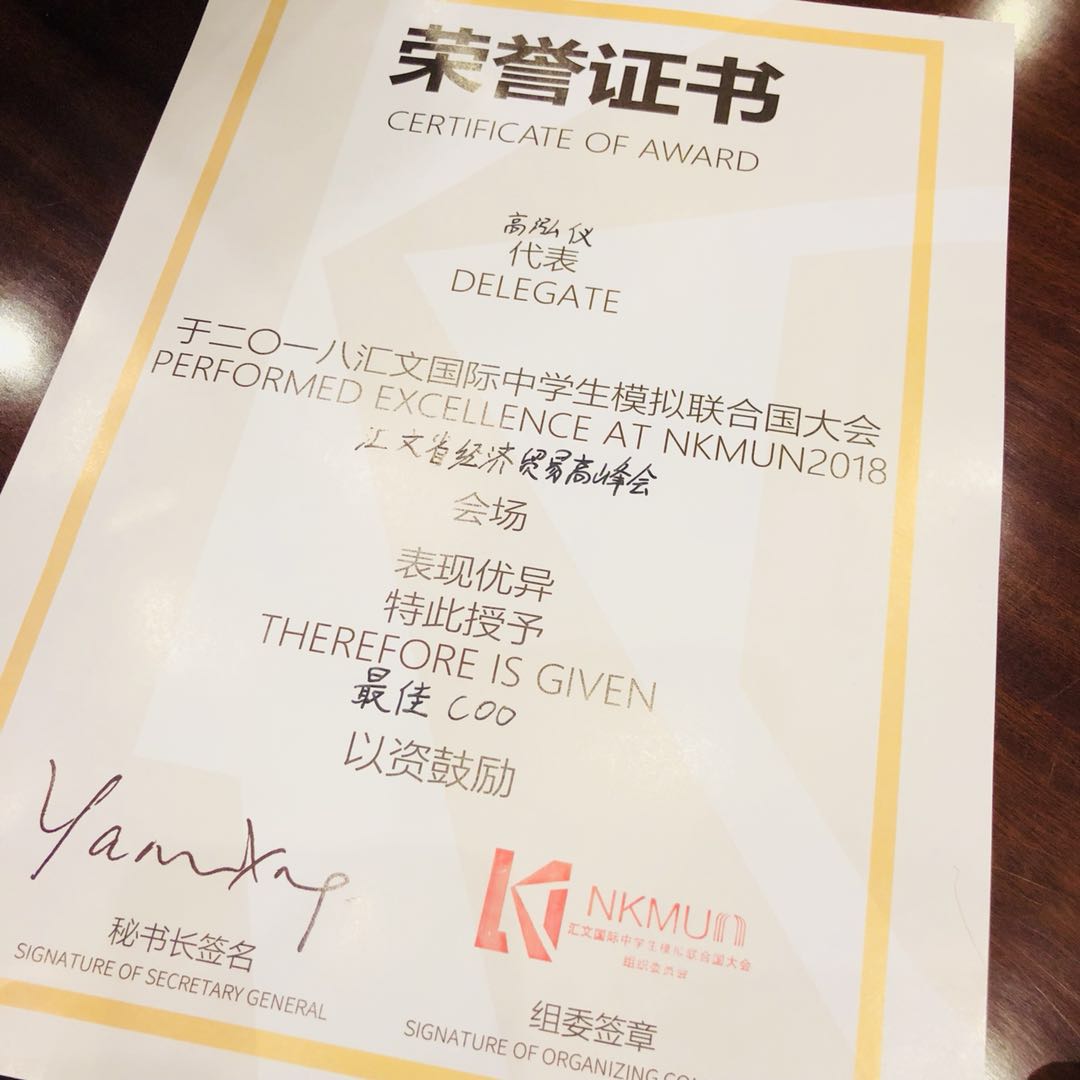 当知道我在经贸会场时,我是十分紧张的因为是特殊委员会需要的学术水平较高,而我对于经济与贸易这方面几乎是一窍不通的。我按照主席们的要求买了相关的书籍去阅读之后,变得更为忐忑,因为书中许许多多的专业名词是我从来没有听闻过的,但是主席让我们六个人为一个小组,每一个小组为一个公司,整个参会的学生被分成了若干小组,有了组员之后才让我紧绷的神经放松了一些。怀着一种紧张又激动的心情来到了南京。