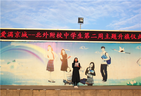 3月5日上午,我校中学举行“爱满京城”北外附校2017-2018第二学期中学生第二周升旗仪式暨学雷锋志愿服务月启动仪式。本周国旗下领唱国歌的班级是初二(4)班,升旗手是来自初二(4)班的魏嘉鑫。