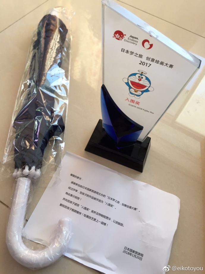 为纪念中日和平友好条约缔结40周年,日本国家旅游局为中国的少年儿童特别举办“日本梦之旅 创意绘画大赛”。本次比赛涵盖小学至初中9个年级,共有1120幅作品参赛,只有140个获奖名额,获奖率不足13%。我校初二日英复语学生阮亦瑄同学成功入围大赛,获得奖杯和奖品,特此祝贺!