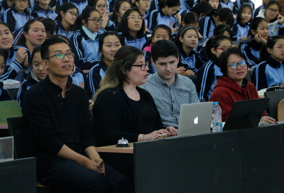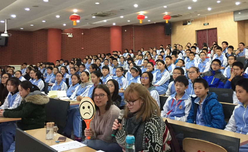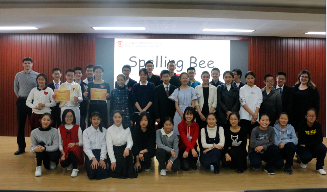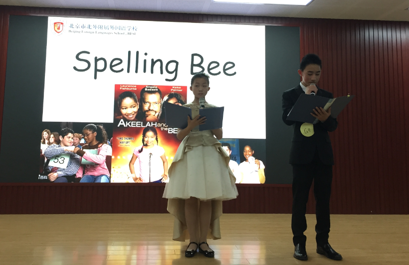 下午初一、初二年级在第二阶梯教室举办了spelling bee拼词大赛。在本学期每单元百词成绩的