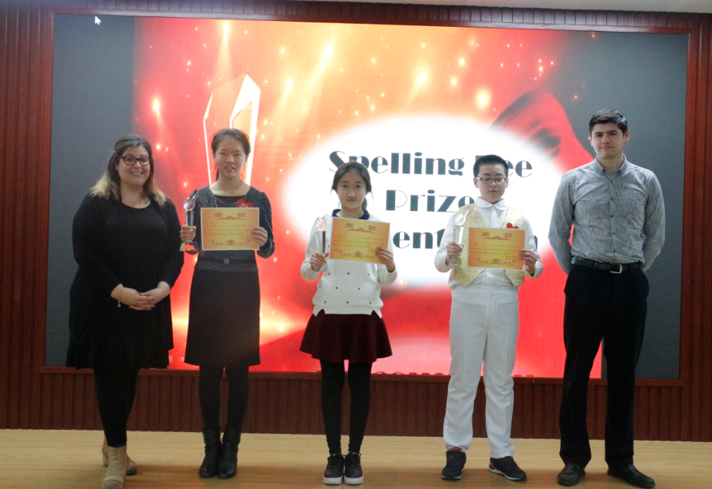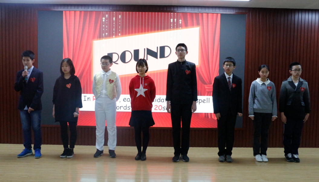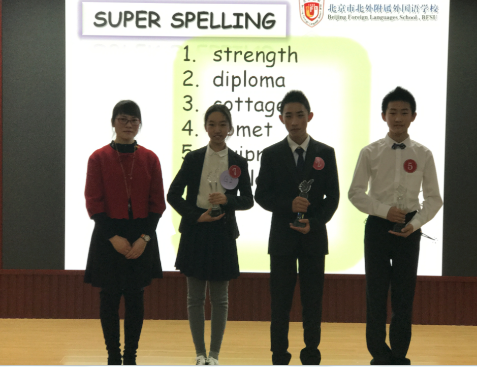 胡婉如夺得本次拼词比赛的冠军,初一7班官以康、初一5班王威昊,初二3班曹阳、初二6班