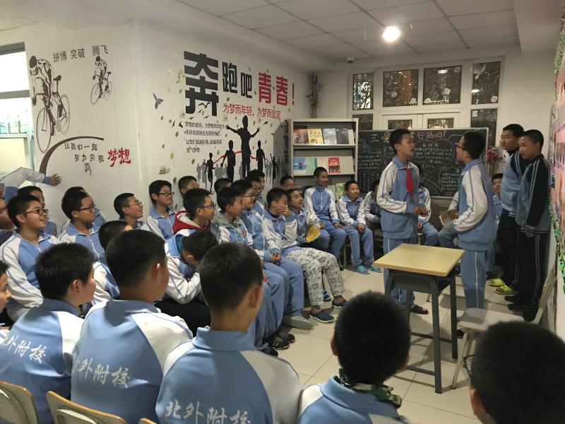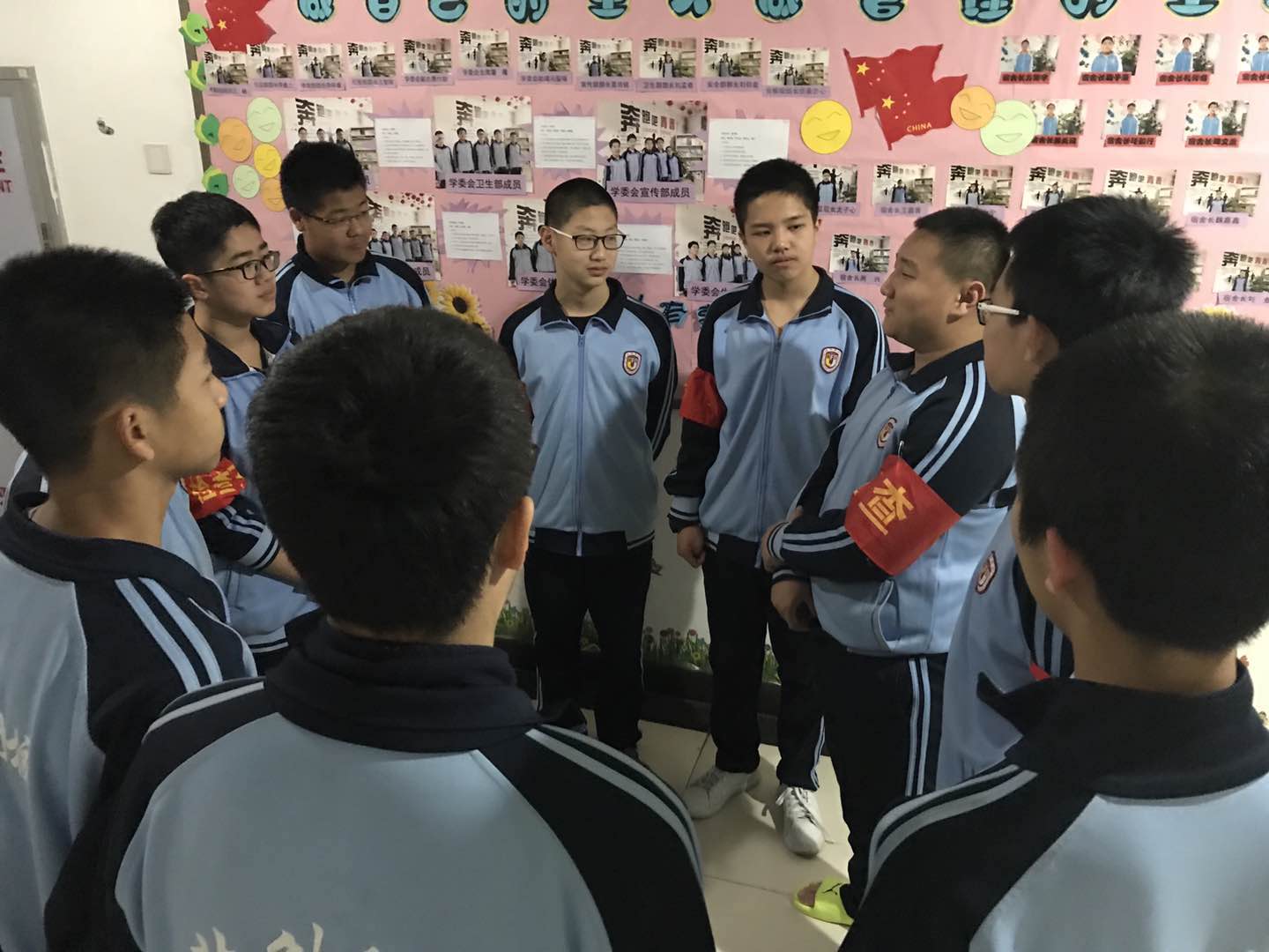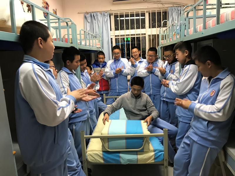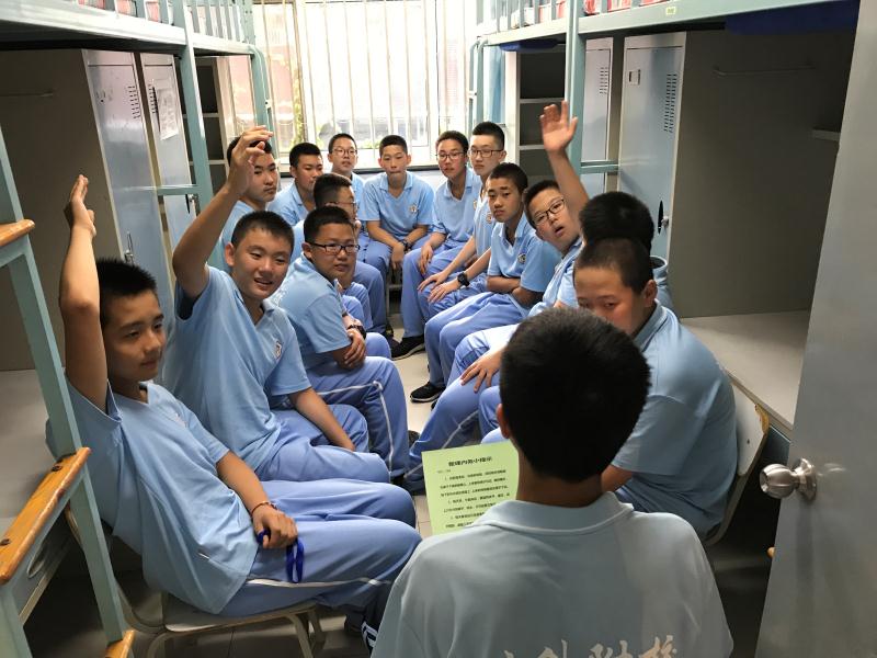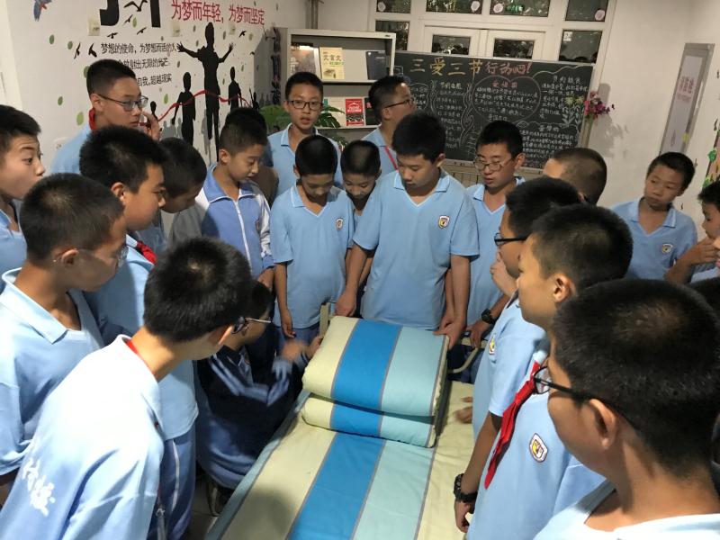 紧接着,第二系列4期“干部传、帮、带——宿舍长系列培训”活动在初二学委会主席初二(2)班王智晖、周兴、高天杨的主持下召开了,培训分为“宿舍长的职责”、“ 管理中遇到的问题”、“ 内务整理检查要求”、“叠军被技能比赛”四个主题单元,全体初一年级男生宿舍长参加了培训。宿舍长们通过“老干部”们绘声绘色的讲解及案例分享,结合自己实际工作经验,对宿舍长工作有了更加全面系统的理解,培训活动使得新生宿舍长很快进入“专业角色”,有效地促进了新生宿舍日常考勤、内务卫生及纪律管理工作。