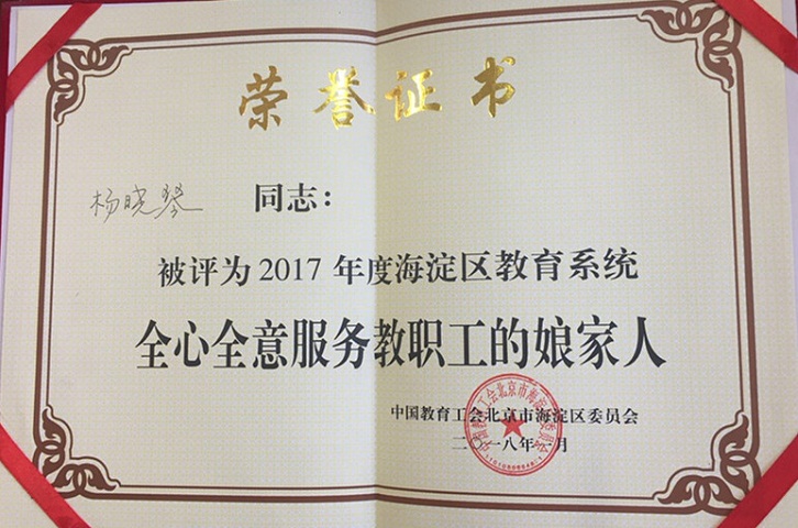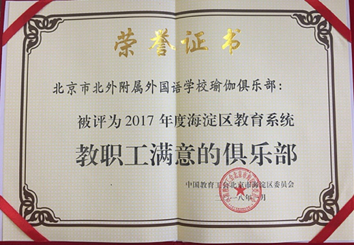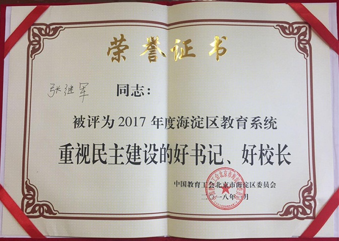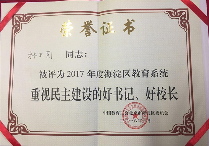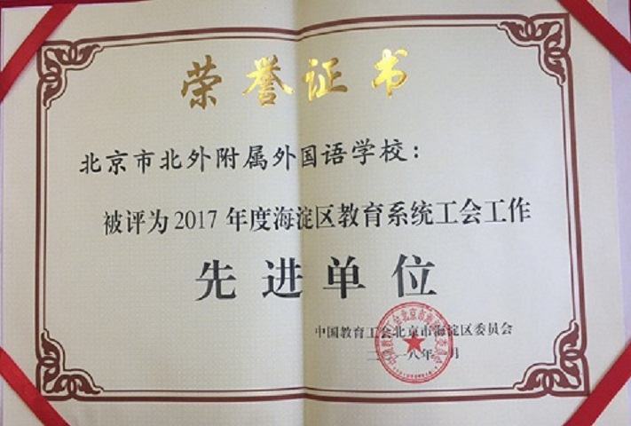 近期,在北京外国语大学工会工作先进单位评选及海淀区教育工会先进单位、先进个人及“四个一批”评选活动及表彰活动中,我校荣获多项集体和个人荣誉,其中学校荣获“北京外国语大学7工会工作先进单位”、“2017年度海淀区教育系统工会工作先进单位”,我校校长林卫民荣获“重视民主建设的好校长”,书记张继军荣获“重视民主建设的好书记”,工会主席杨晓琴荣获“全心全意服务教职工的娘家人”,校工会承办的区教工瑜伽俱乐部荣获“2017年海淀区教育系统教职工满意的俱乐部”等多项荣誉。