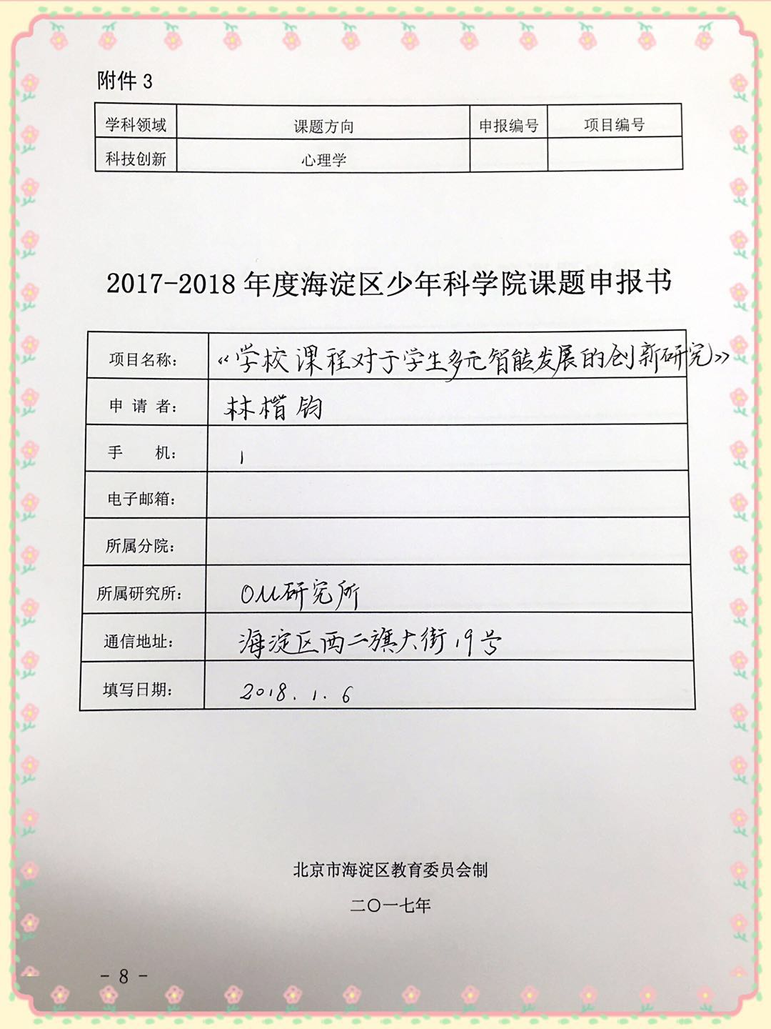 为落实海淀区少年科学院“七个一工程”中“完成一个科学创新课题研究”的要求,发挥海淀区少年科学院的引领作用,培养中学生创新精神和实践能力,1月 6日,我校海淀区少科院OM研究所与中科院联合开展了“科技创新课题研究”项目。海淀区少科院首批“小院士”,我校初三(3)班 林楷钧同学担任课题组长,初中科技创新工作坊的潘铎轩老师担任指导教师。
